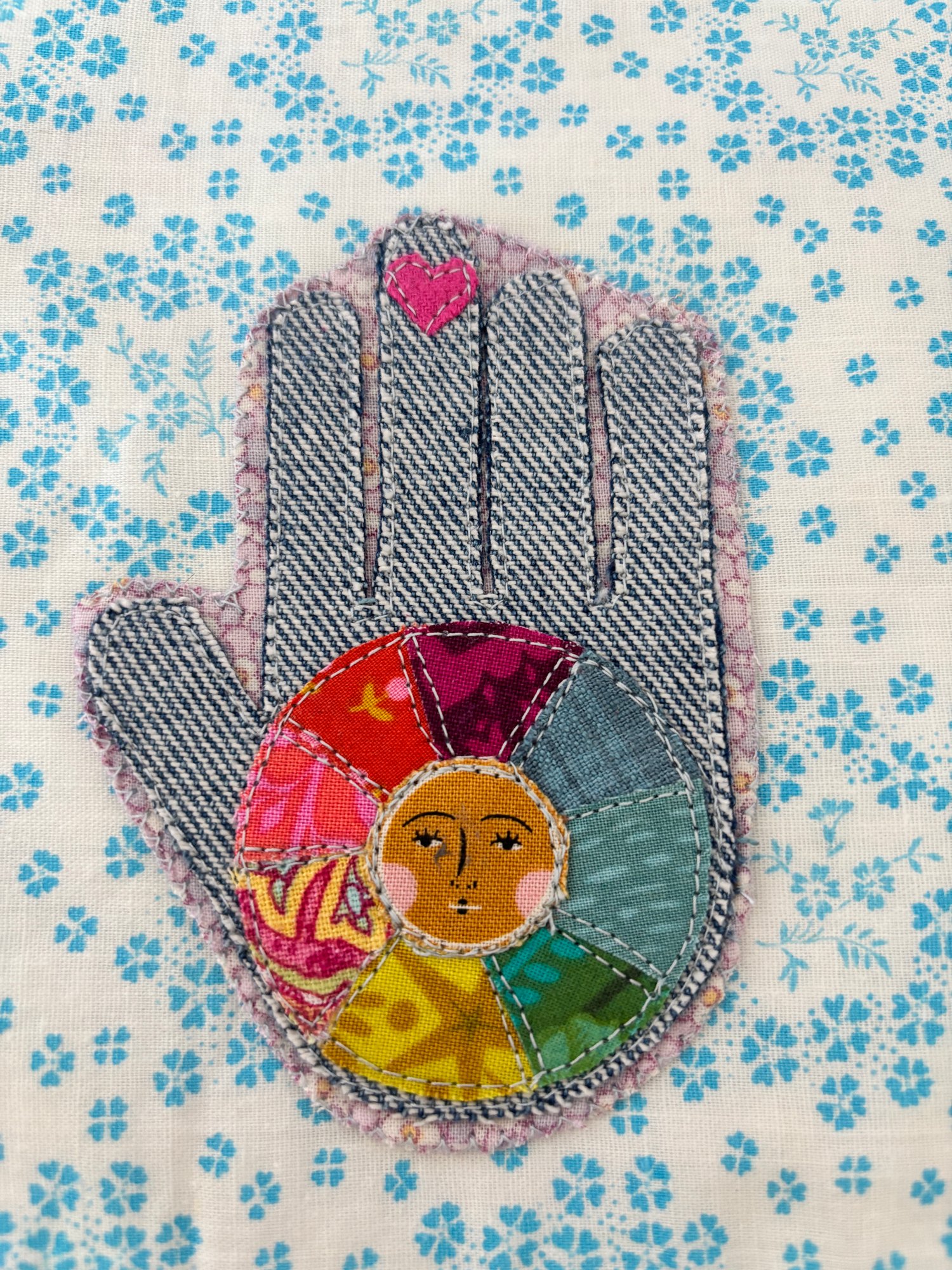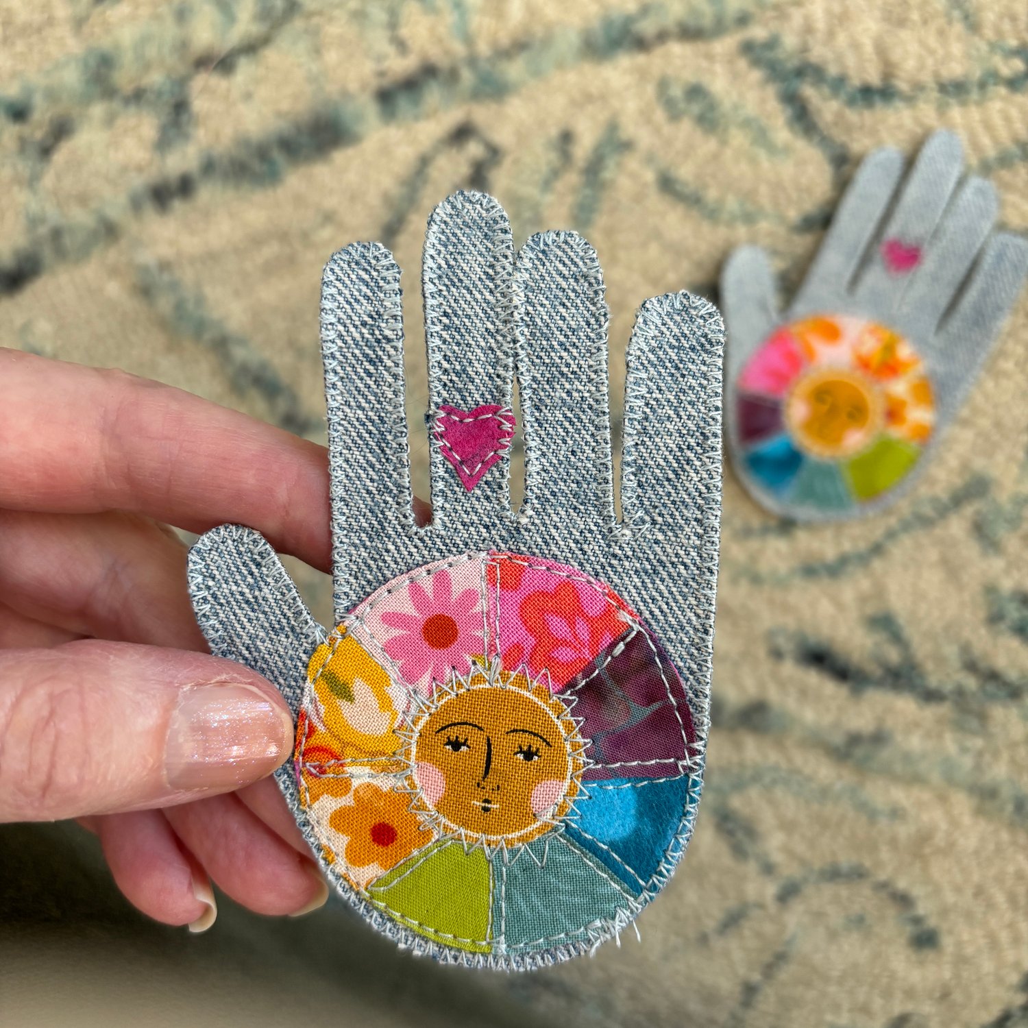 This colorful fabric appliqué hand patch is one of my favorite things I've ever made, and now you can make one too. Each patch is a little work of art — a rainbow of fabric triangles radiating out from a center piece of your choice (sun, heart, peace sign, flower, bird, or whatever fun fabric speaks to you). Add a tiny heart on one finger and you've got something truly special.