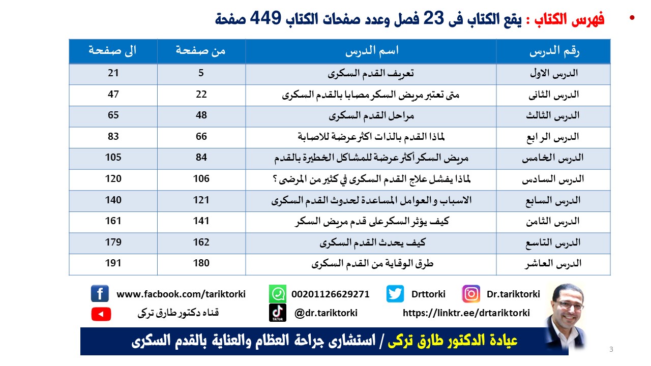 يتألف الكتاب من 23 بابًا أساسية تغطي كافة جوانب القدم السكري، وهي كالتالي: