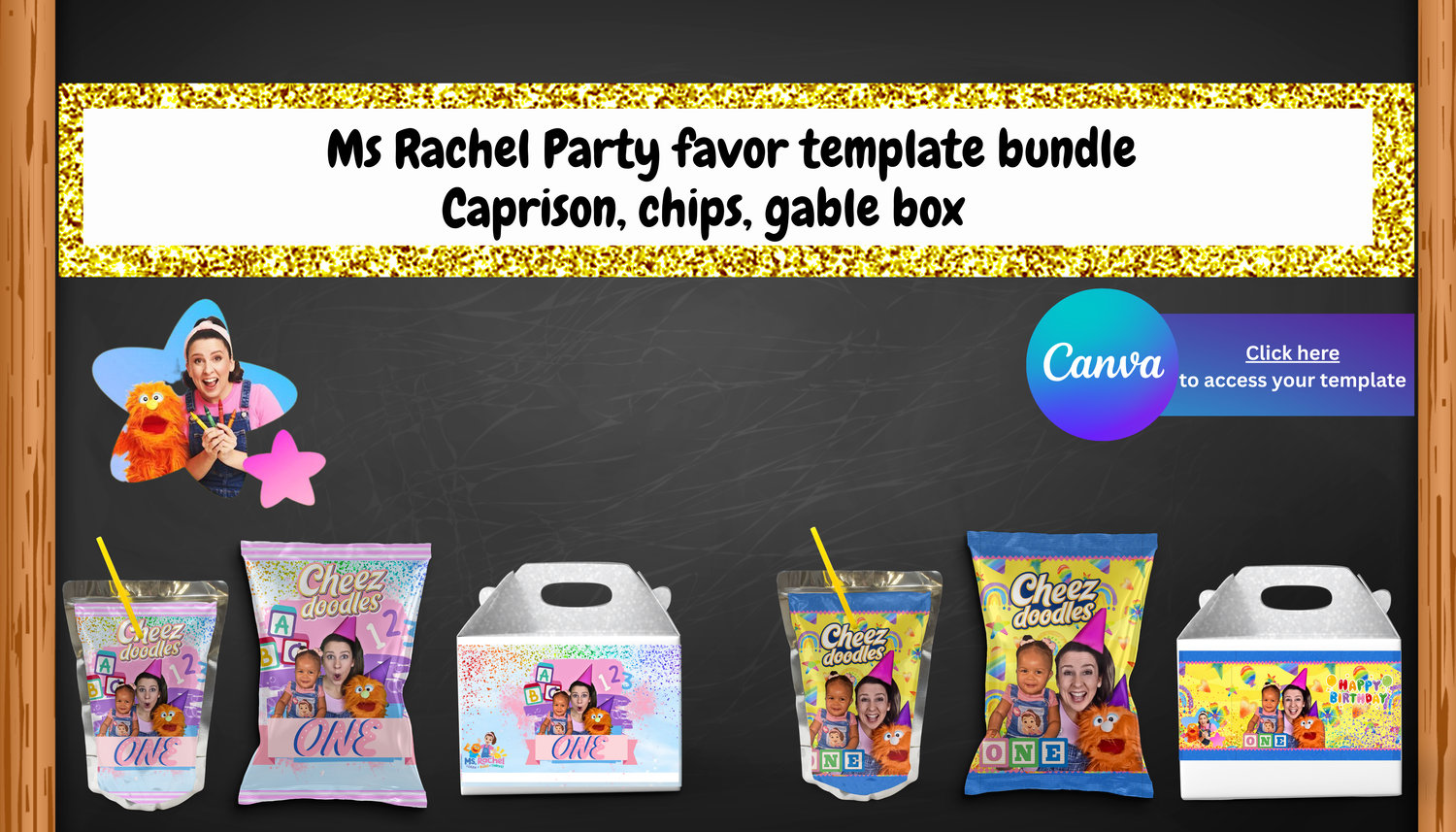 Ms. Rachel Party Favor Template Bundle – Capri Sun, Chips, Gable Box (Editable in Canva)