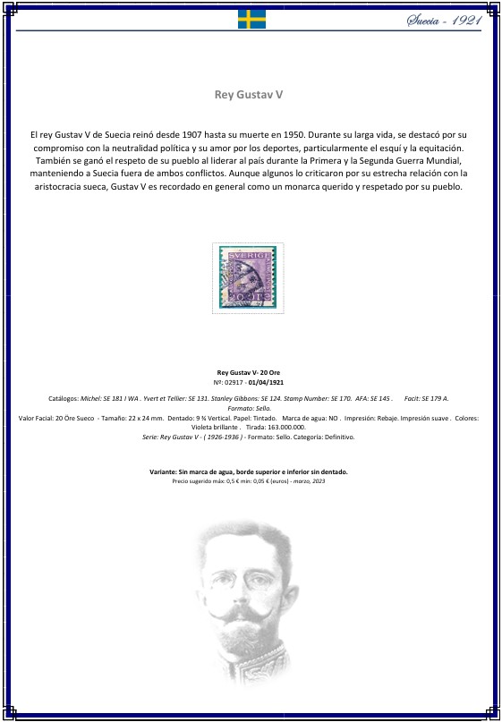 Ficha filatélica SE‑1921‑02917 – Suecia 1921 Gustav V (PDF A4)