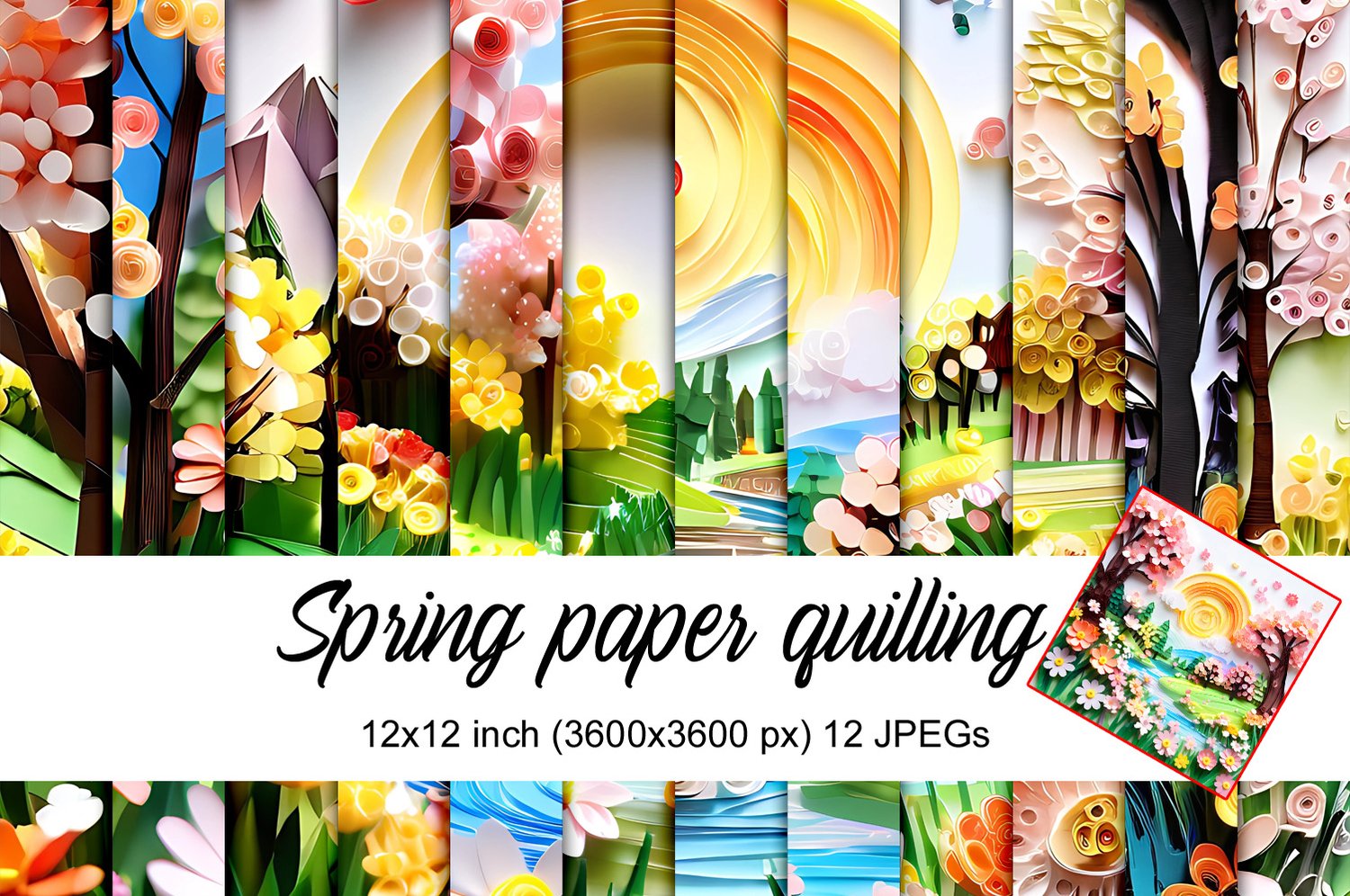 Spring scene paper quilling is collection of digital images, in size of digital paper – 3600 x 3600 pixels (or 12×12 inches).