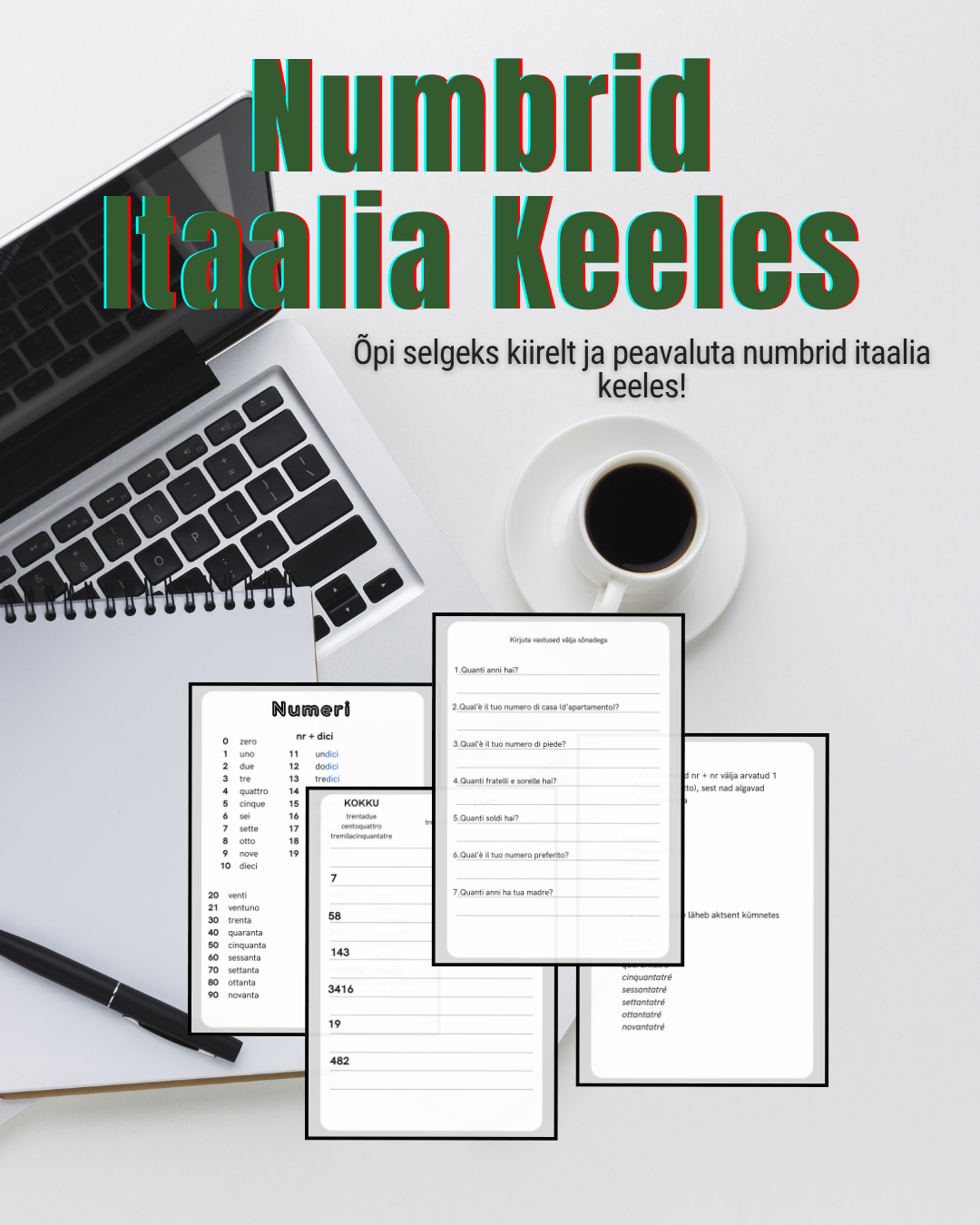 Töölehed, et õppida selgeks kiirelt numbrid itaalia keeles. Sisaldab seletusi ja harjutusi, sobiv nii lastele kui täiskasvanutele.