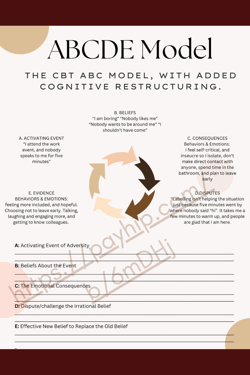 Improve your understanding of the ABCs of CBT, and enjoy the added D&E for some work in the cognitive restructuring realm. This worksheet includes an example of the ABCDE model in action, as well as space to explore the ABCDEs using your own experience in the bottom of the worksheet.