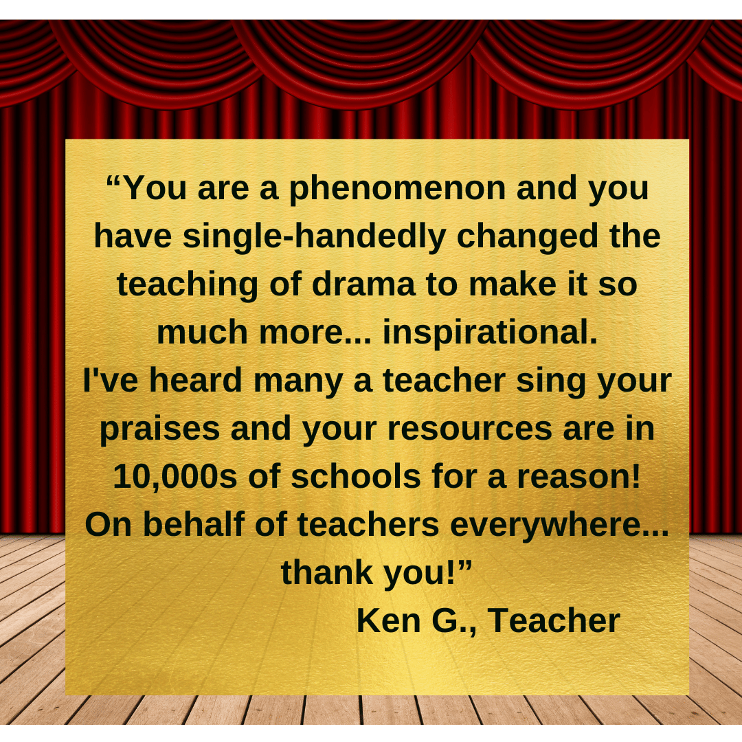 "You are a phenomenon and you have single-handedly changed the teaching of drama to make it so much more... inspirational. I've heard many a teacher sing your praises and your resources are in 10,000s of schools for a reason! On behalf of teachers everywhere... thank you!"