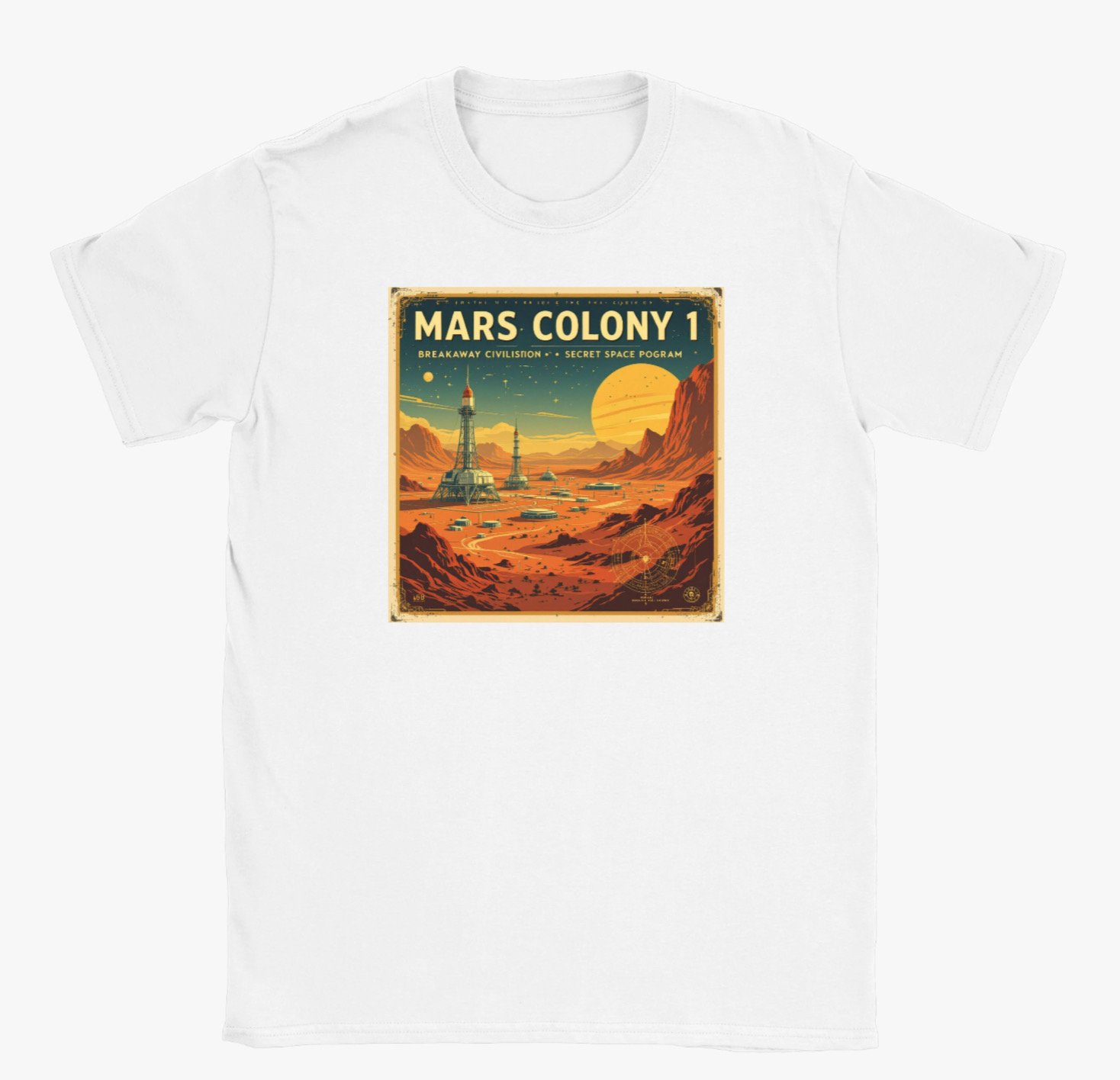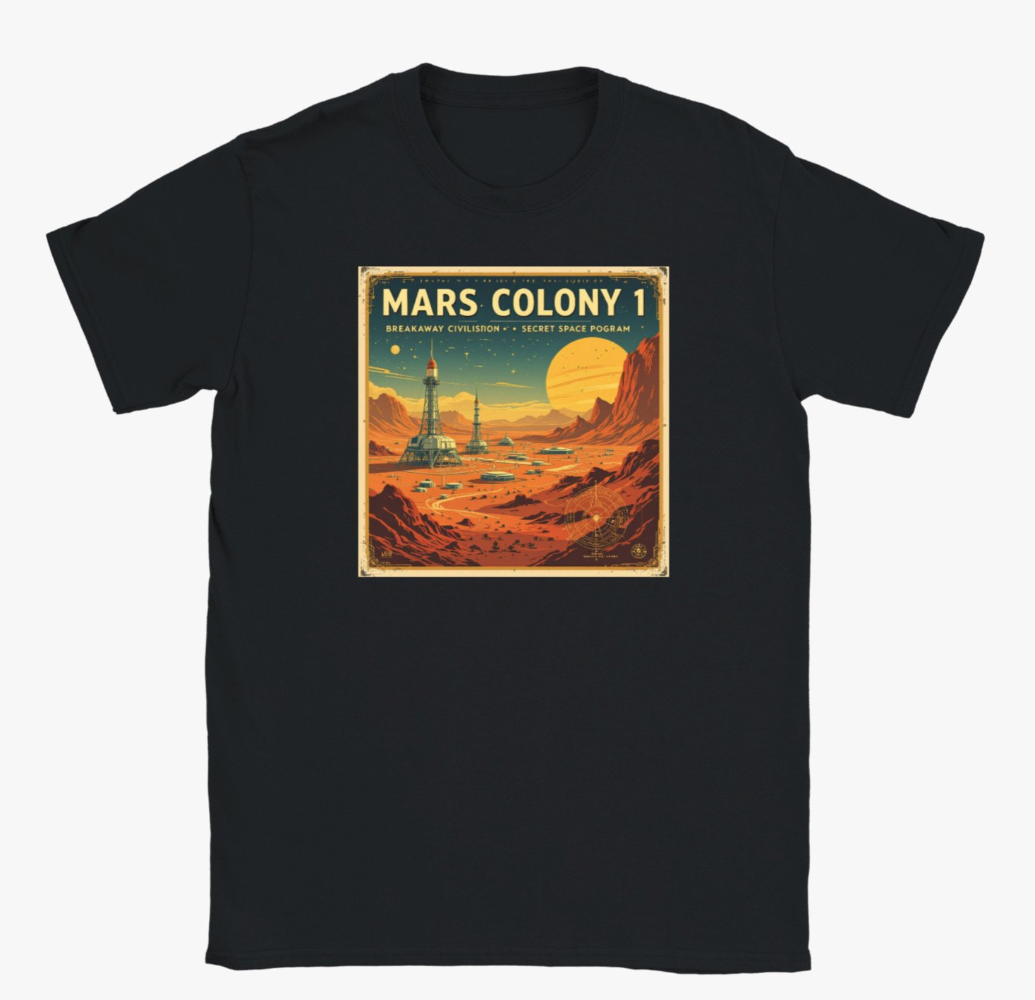 Step into an off-world adventure with the Mars Colony 1 T-shirt, featuring a bold retro-futuristic illustration inspired by classic sci-fi exploration posters. The vibrant artwork showcases a visionary Martian settlement—complete with towering launch structures, rugged red-planet terrain, and a glowing alien horizon.