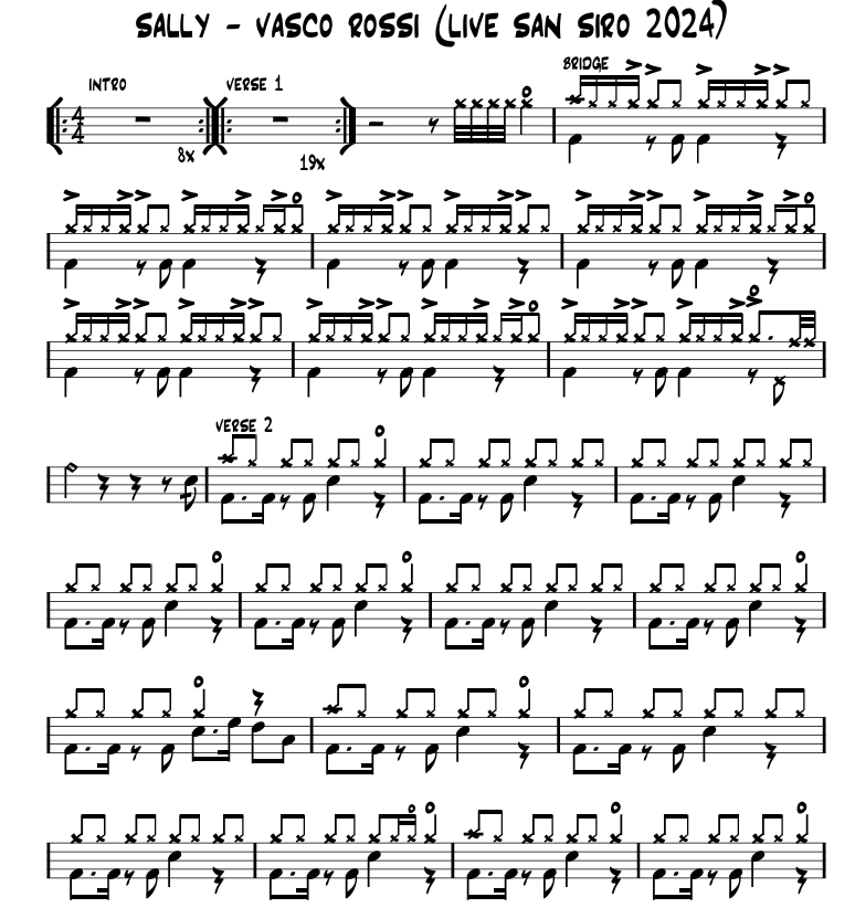 Sally - Vasco Rossi (Live San Siro 2024) Full Drum Transcription in PDF