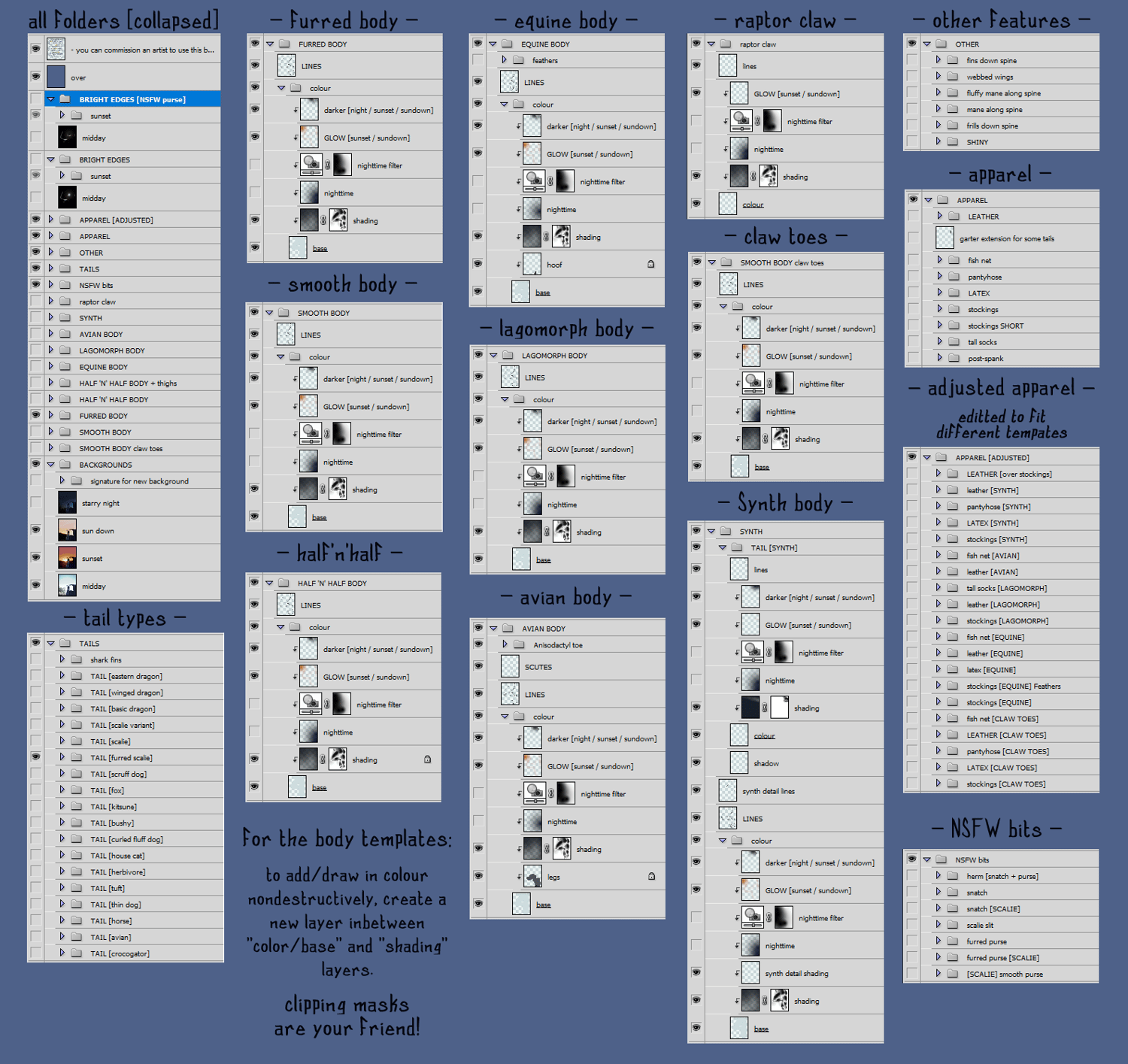 - Body/peet templates: [ALL BODY/PEET TEMPLATES] furred, smooth, smooth [claw toes] half'n'half [half furred, half smooth], avian, equine, lagomorph, Synth