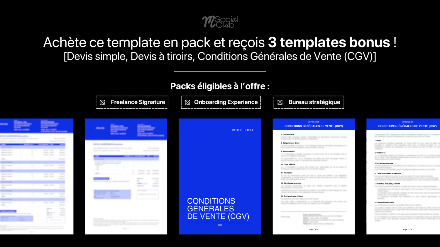 Achète ce template en pack et reçois 3 templates bonus : un devis simple au branding de ta marque, un devis dit "à tiroirs" (idéal pour proposer plusieurs prestations au sein d'un même document), et tes Conditions Générales de Vente (CGV), obligatoires et indispensables pour encadrer toute collaboration !