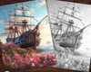 ships, pirate ships, flowers, ocean, waves, peonies, anchors