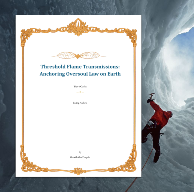 The T4 Codex introduces the concept of the Threshold Flame, which serves as a source of clarity, guardianship, and covenant for souls crossing significant thresholds. It emphasizes the importance of coherence, sovereignty, and reciprocity in embodying Oversoul Law. Practices encourage individuals to engage with the Flame, fostering remembrance and connection to Earth’s ascension.