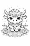 Bring the joy of Diwali into your home with Bella Moo, the adorable baby highland cow! This digital coloring page features Bella Moo sitting surrounded by glowing diya lamps, a beautiful rangoli pattern, and a cheerful marigold garland. Perfect for kids and adults alike, this cozy and playful design makes coloring fun and relaxing.