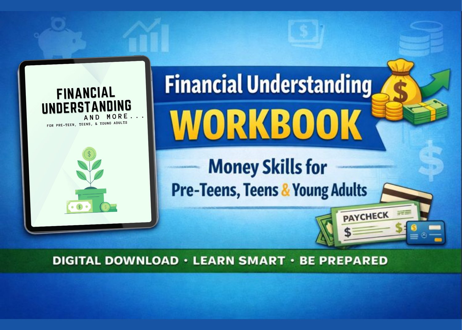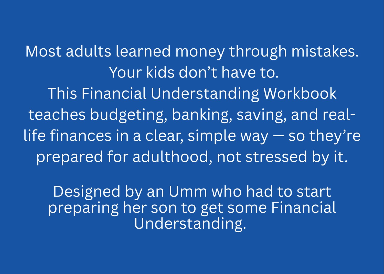 This Financial Understanding Workbook was designed to give pre-teens, teens, and young adults the money skills most of us had to learn through stress, mistakes, and trial-and-error. Instead, this workbook provides clear, practical guidance that builds confidence, responsibility, and independence.