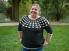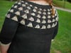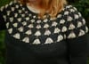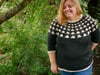 Basé sur une construction yoke, ce pull se tricote du haut vers le bas (top down), principalement en jersey, accompagné d’une jolie dentelle ornée de mailles allongées, comme de jolies passiflores qui envahissent le yoke.