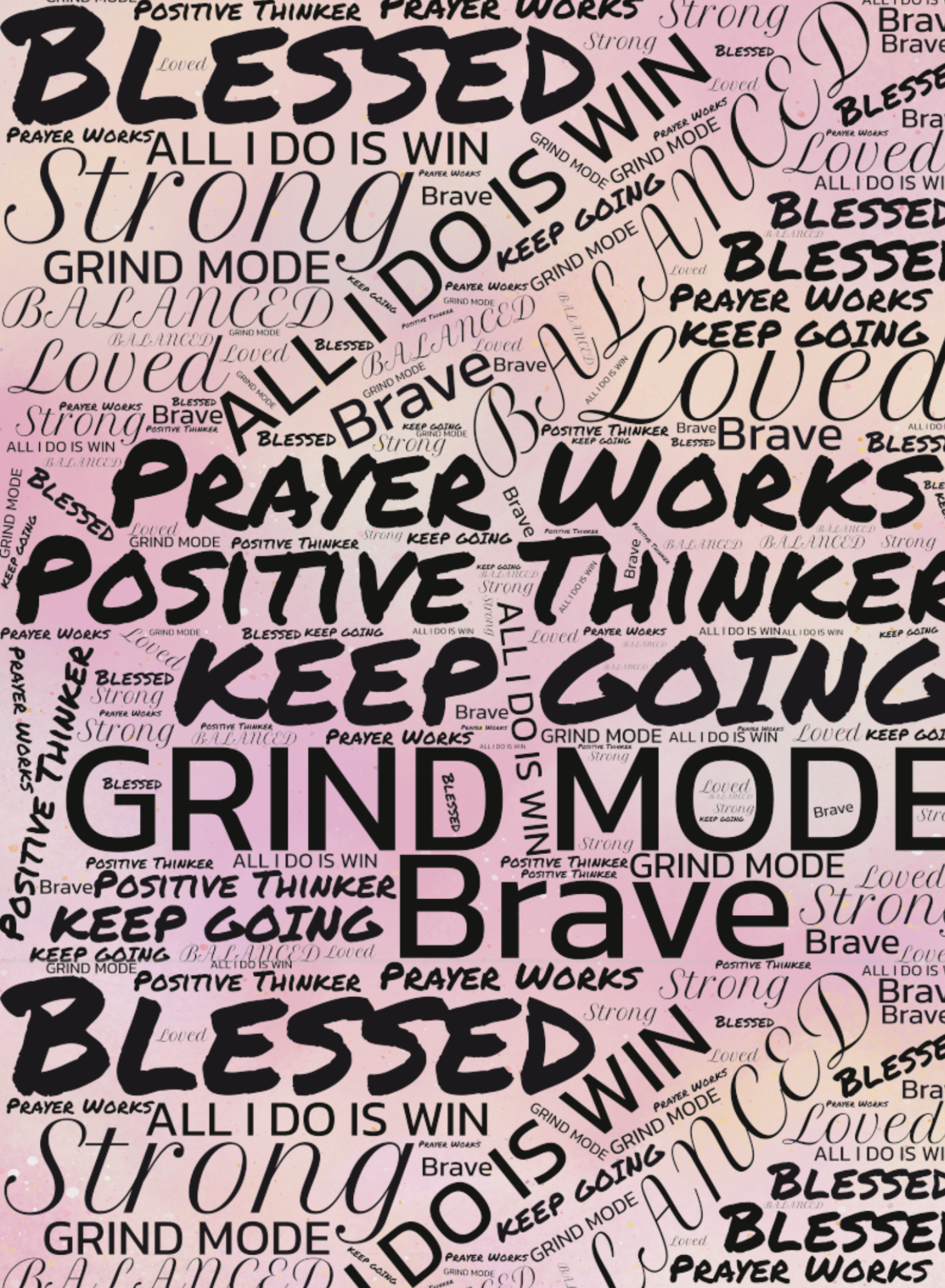 Stay inspired on the go with this gorgeous A5 Pink Affirmation Journal featuring a collage of powerful words like Blessed, Strong, Prayer Works, Keep Going, Brave, and Grind Mode.