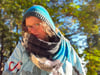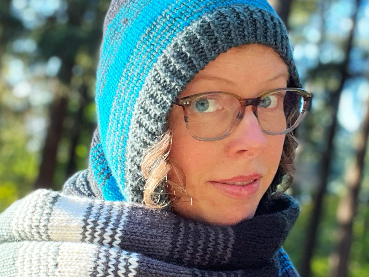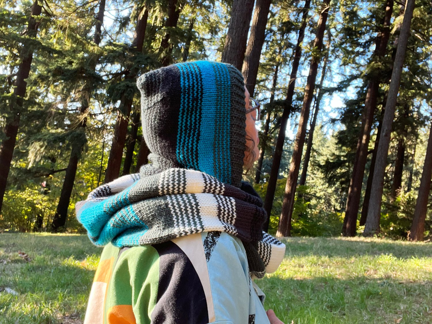 Double Feature is an any-gauge double-sided cowl and a hood, designed to be knit while watching movies! Change colors for each movie so that each stripe represents a movie.