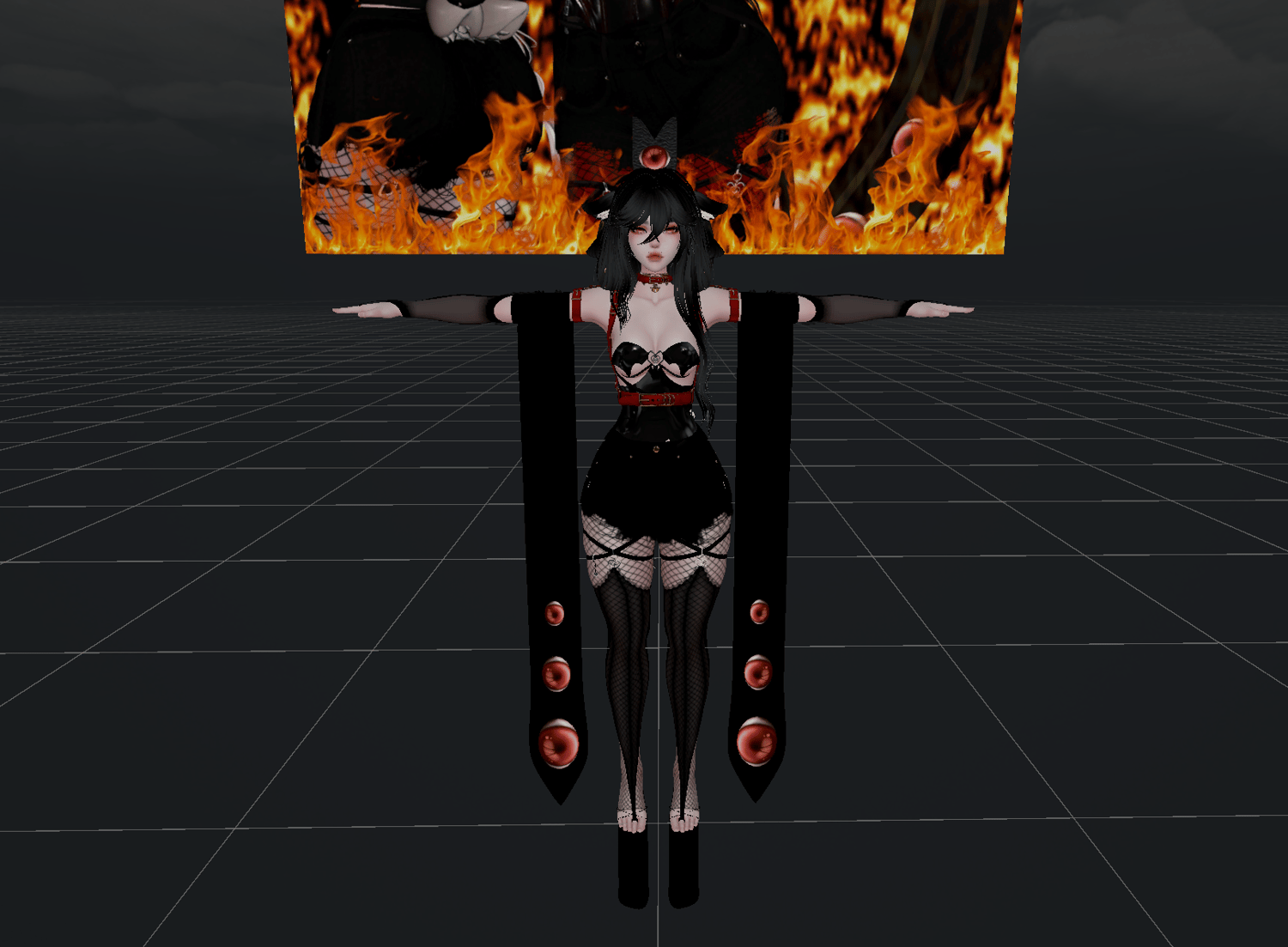 Hat, Veil, Knife, Knife Holster, Flowing Arm Wraps, Ears, Tail, Fire Hand Particles, Pentagram Fire Aura, Blinking Eyes, Sword with Fire, Full Body Dissolve Particle Burst by Kismet - Will be for sale separately/in nitro at a later date.