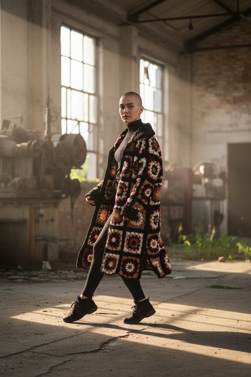 This cardigan is an ode to handmade creation. Inspired by the timeless beauty of granny squares, it combines warmth, character, and uniqueness. Each motif flows harmoniously into the next, creating a garment that does not simply follow fashion, but tells a story.