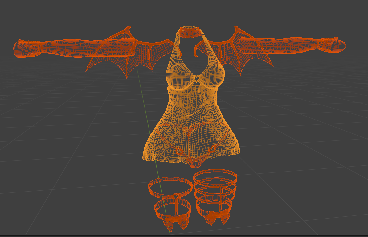 ♡ collar: 432 verts, 768 tris; babydoll: 6217 verts, 11848 tris; panty: 1047 verts, 1820 tris; sleeves: 4652 verts, 9144 tris; garter: 5171 verts, 9806 tris; wings: 6094 verts, 12140 tris