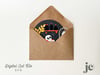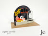 I imagine a cute li'l witch would have a cute li'l office, right?! This fun pop-up card features a black kitty gazing at his ghostly friend, floating in a bell jar. On the desk, is a stack of magic books, a skull and a vase with a spray of foliage. Behind the desk is a shelf with bottled potions. The bell jar is cut from .007mil acetate and glued/sandwiched between the bell jar outlines for a transparent effect and allows for the ghost to "float" in mid air.