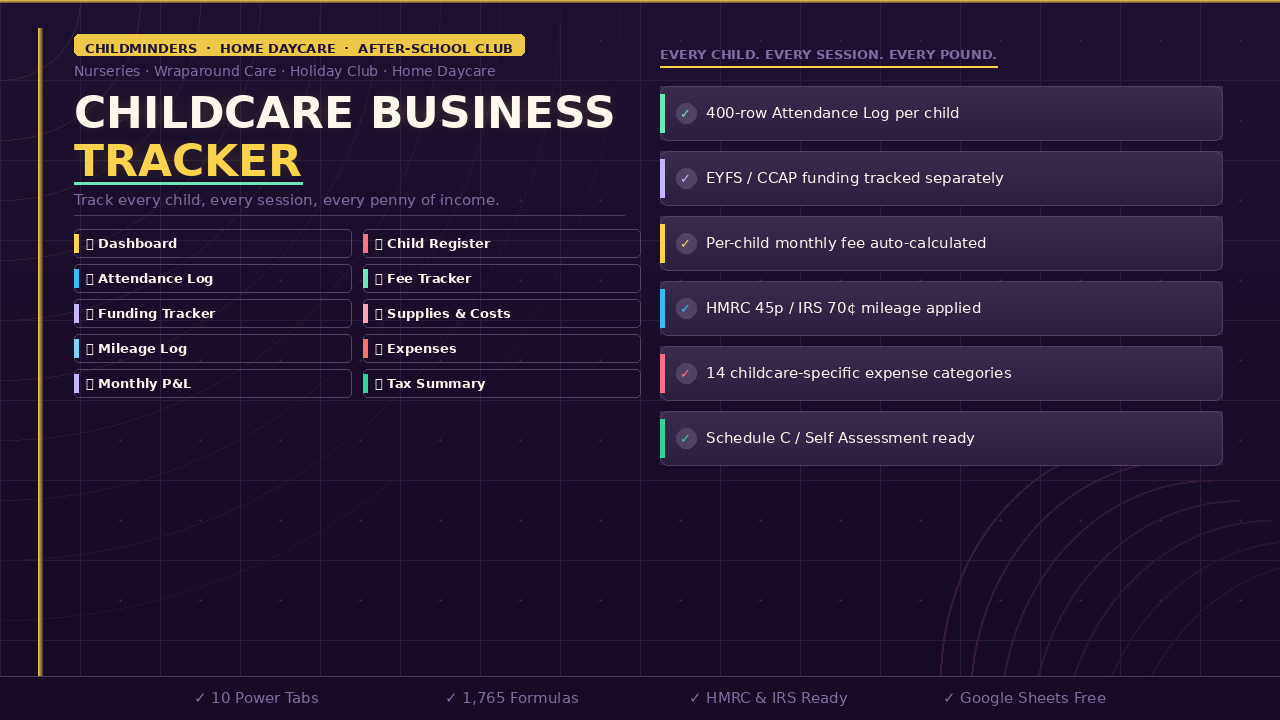 This tracker fixes every single one of those problems. Ten professional tabs give a complete childcare business operating system: log every session with child, session type, hours, billed amount, and funding offset so net income appears instantly. Track every government funding claim in its own dedicated tab โ EYFS 15hr, EYFS 30hr, 2yr funding, CCAP, Tax-Free Childcare โ all kept separate from parent fees exactly as HMRC and IRS require.