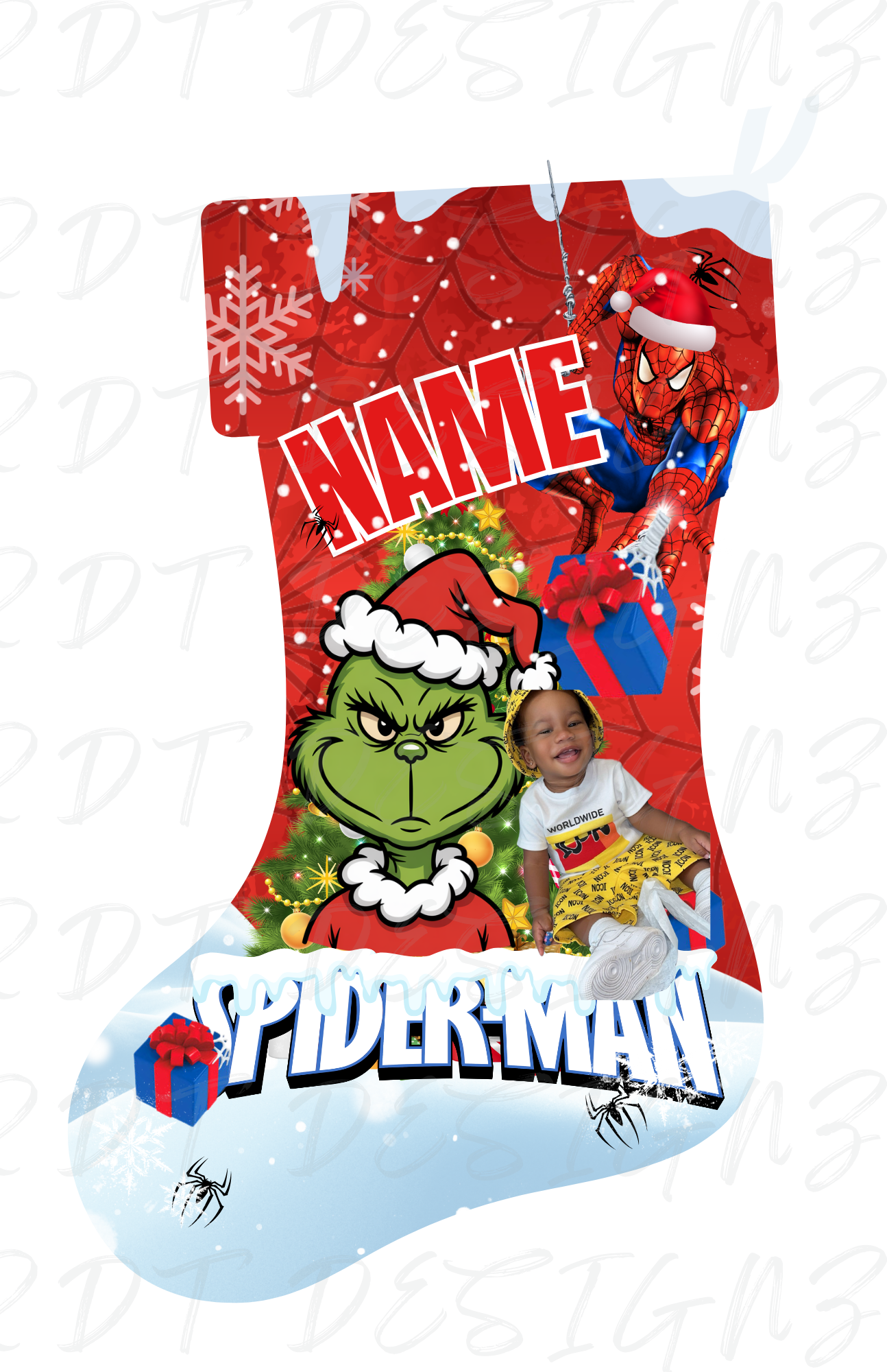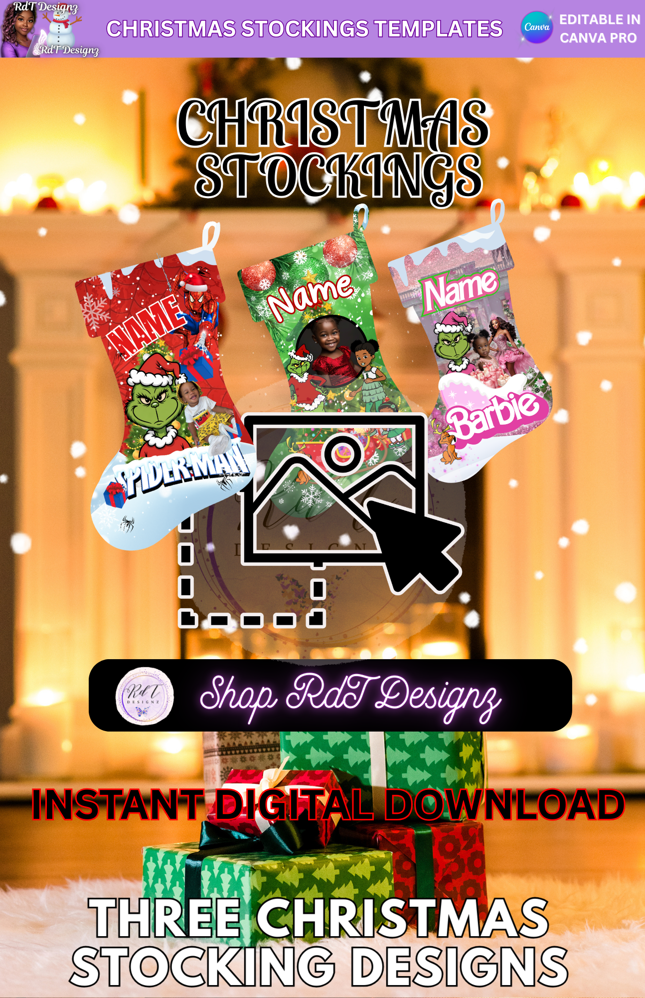Get ready to add a festive touch to your holiday decor with our delightful Editable Christmas Stockings Digital Template! This charming set features three unique designs showcasing beloved characters: Spider-Man, The Grinch from Dr. Seuss, Gracie's Corner, and Barbie. Perfect for fans of all ages, these stockings are sure to bring joy and excitement to your Christmas celebrations.