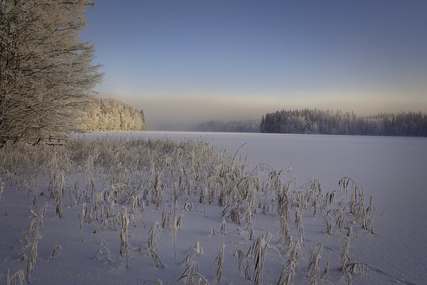 Sunset on the shore of a frozen lake. A frosty day in December.