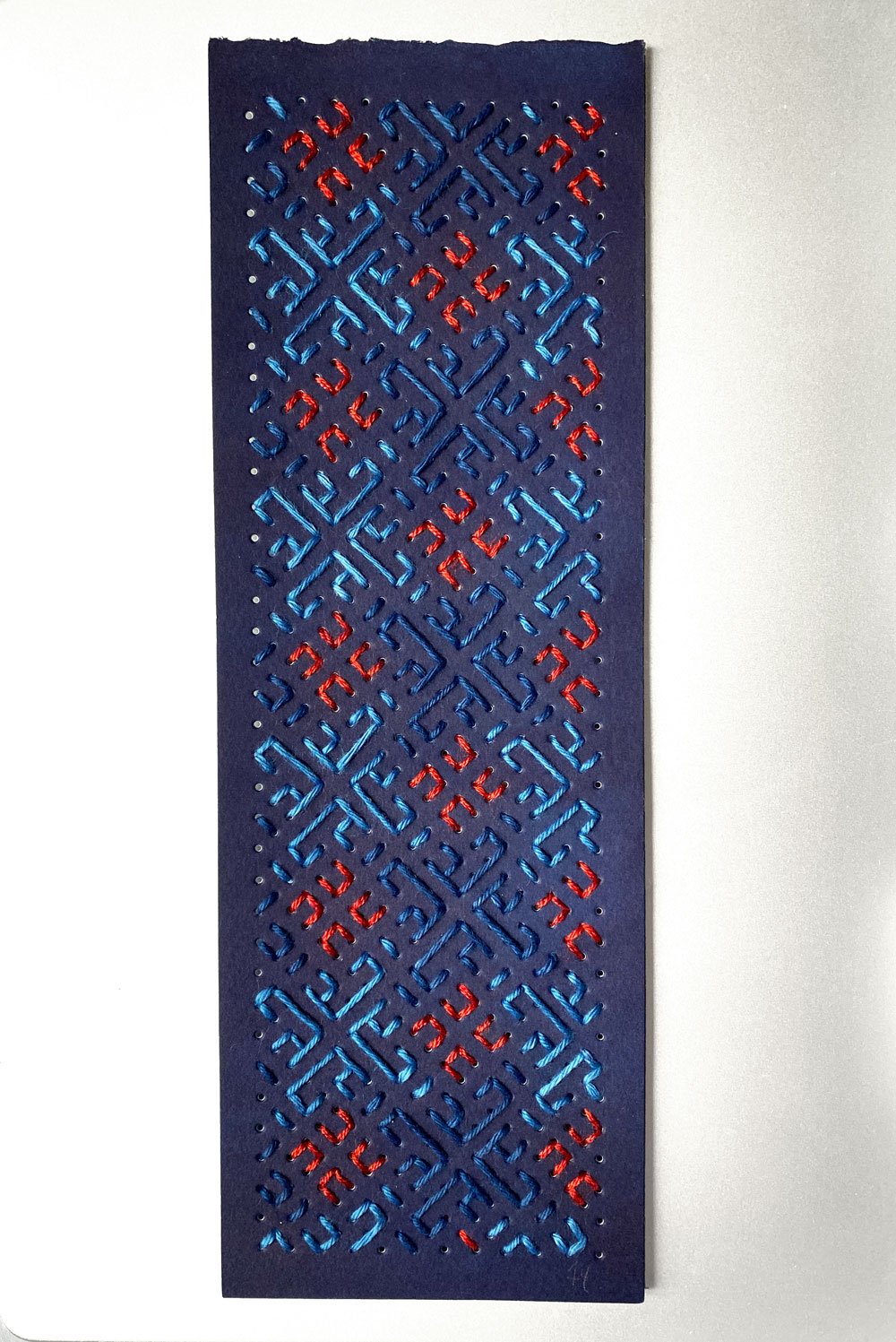 Indigo-dyed combed silk and madder-dyed silk thread, stitched on indigo-dyed paper, 10x28 cm.