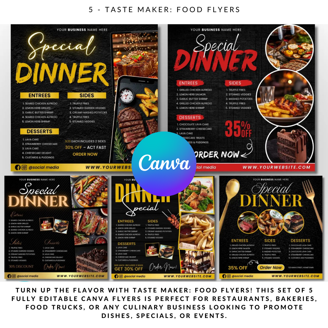 Turn up the flavor with TASTE MAKER: Food Flyers! This set of 5 fully editable Canva flyers is perfect for restaurants, bakeries, food trucks, or any culinary business looking to promote dishes, specials, or events. Trendy, professional, and bold these flyers are designed to make mouths water and bookings pop.