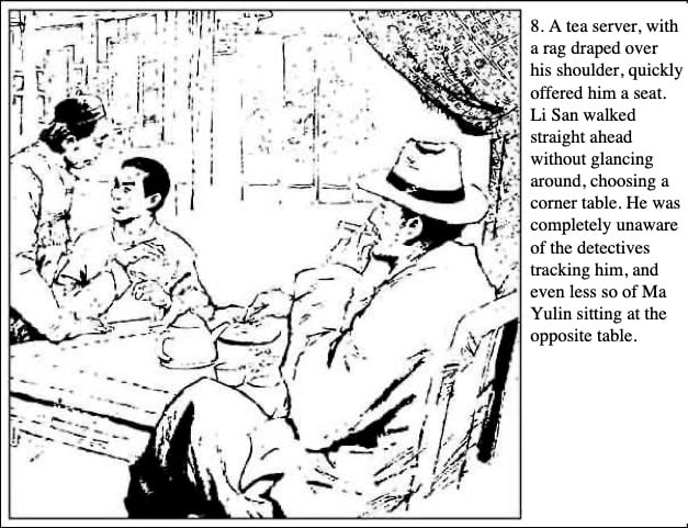 8. A tea server, with a rag draped over his shoulder, quickly offered him a seat. Li San walked straight ahead without glancing around, choosing a corner table. He was completely unaware of the detectives tracking him, and even less so of Ma Yulin sitting at the opposite table.