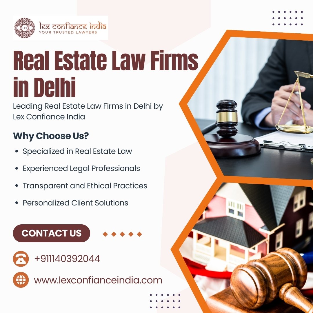 Secure your real estate investments with Lex Confiance India, one of the leading real estate law firms in Delhi. From property due diligence to lease agreements and dispute resolution, our expert team handles all aspects of real estate law. We deliver personalized solutions for residential, commercial, and industrial property matters. Choose Lex Confiance India for seamless and legally sound real estate transactions in Delhi.