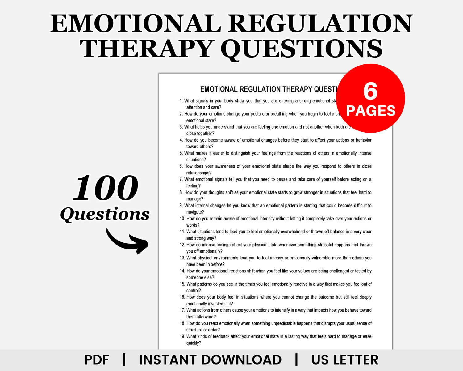 Designed to enhance client engagement and drive positive change, this therapy resource offers a collection of emotional regulation therapy questions. Tailored to the principles of self-regulation of emotion, these therapy questions will guide your sessions towards productive conversations and transformative outcomes. These emotional regulation questions are made to elicit insightful responses and encourage clients to explore their goals and aspirations.