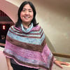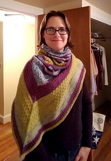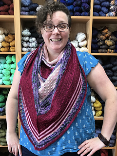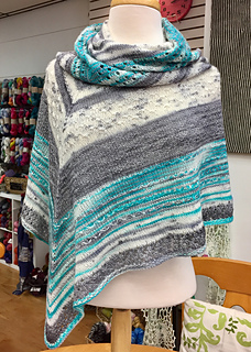 It is top down, seamless, with a “V.” There are a variety of stitches to keep it interesting and it is designed for solids, speckles, variegated or a combination of all three. It tends to grow with length after blocking, so you may end up with a longer garment which doesn’t really matter – more merino for snuggling into this winter!