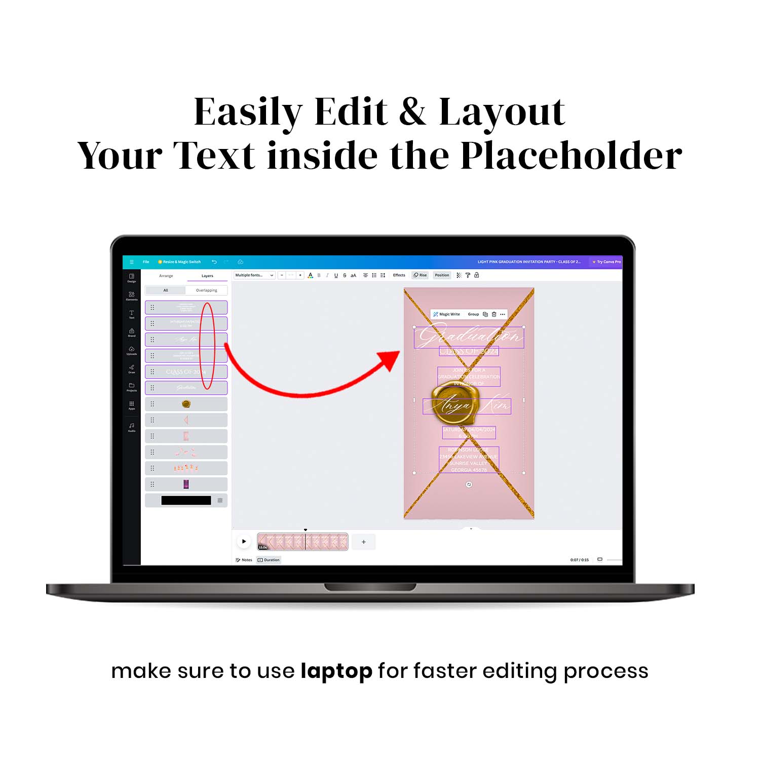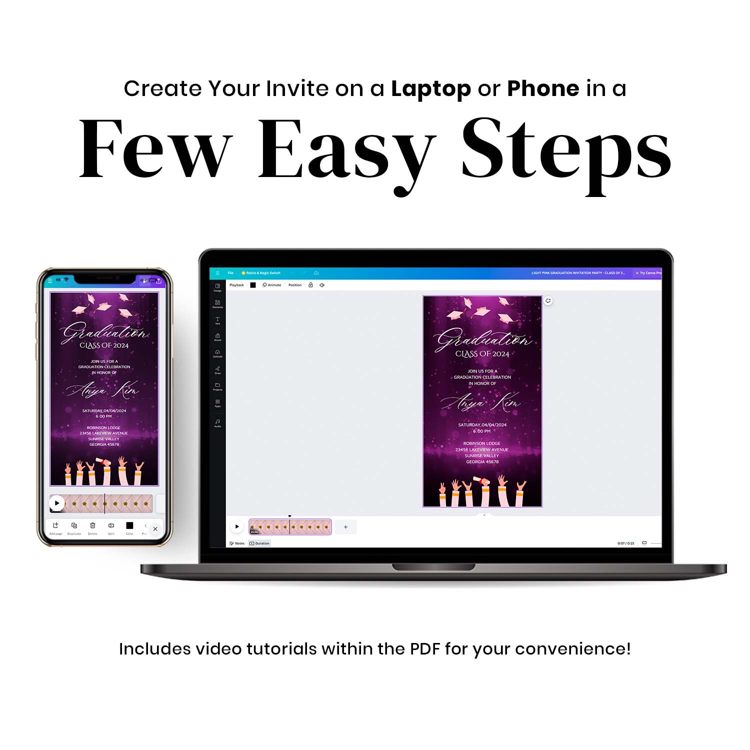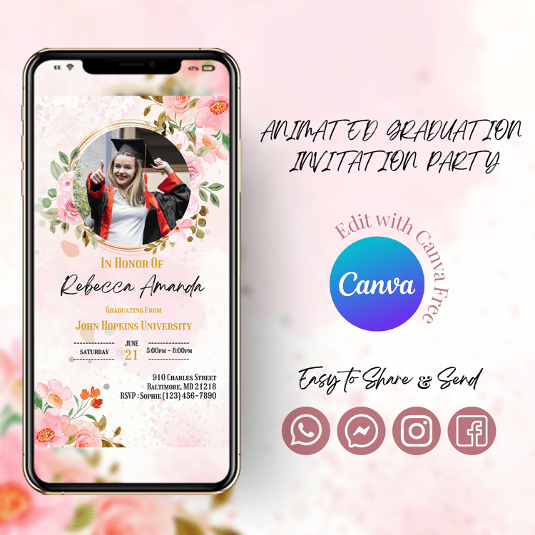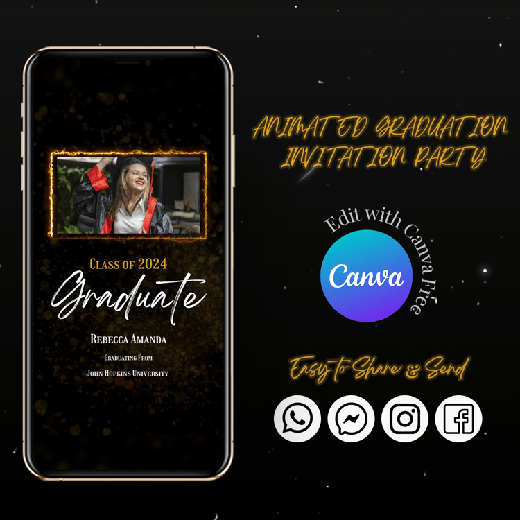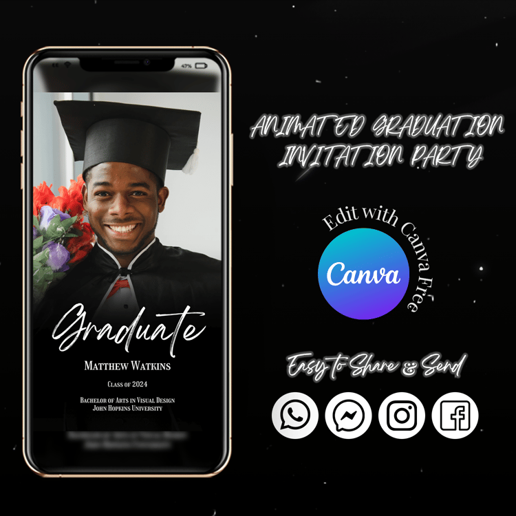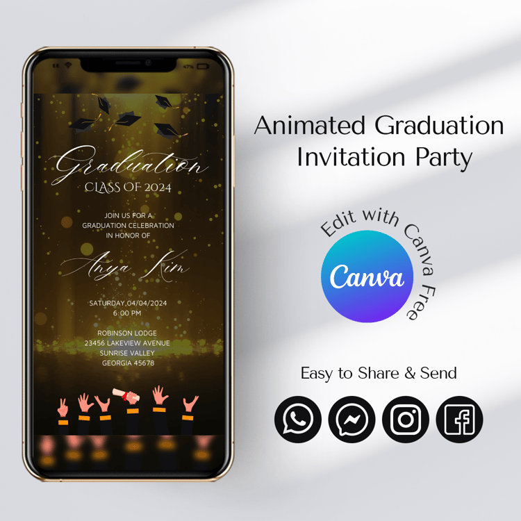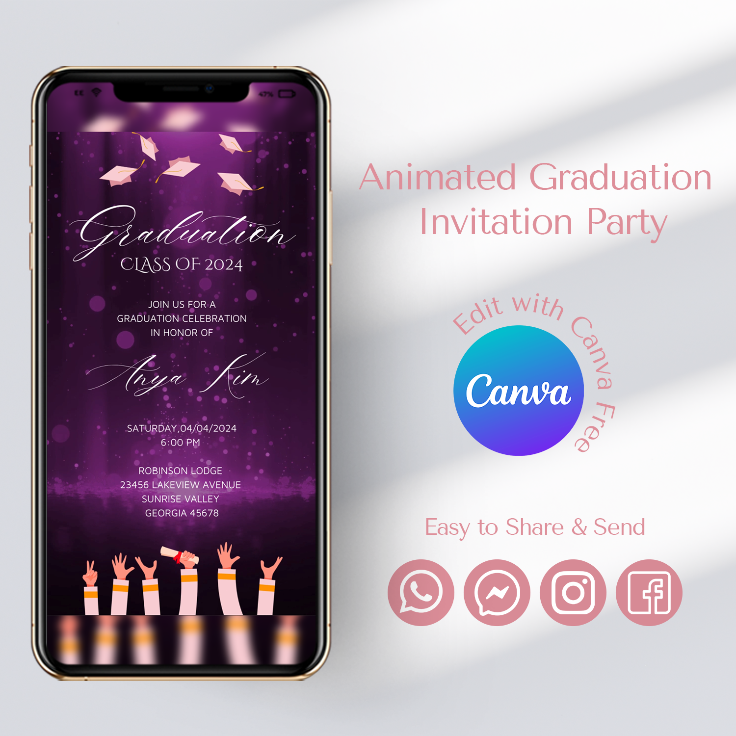 Invite your guests to your graduation event with a unique and modern touch using this special animated graduation party invitation templates. With the convenience of a video text message, it’s quick and easy to send. This template provides instant access without any need for installation.
