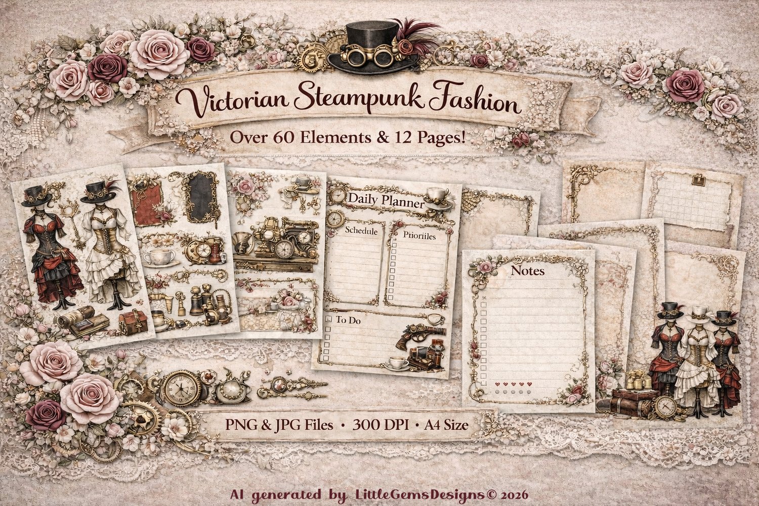 Victorian Steampunk Fashion Digital Kit – Elements, Planner Widgets & Junk Journal Pages