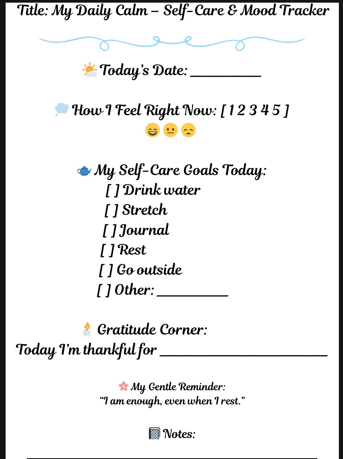 My Daily Calm Tracker is a gentle, one-page printable designed to help you slow down and check in with yourself each day. With simple sections to note your mood, stress level, and calming activities, it encourages mindful reflection without feeling overwhelming.