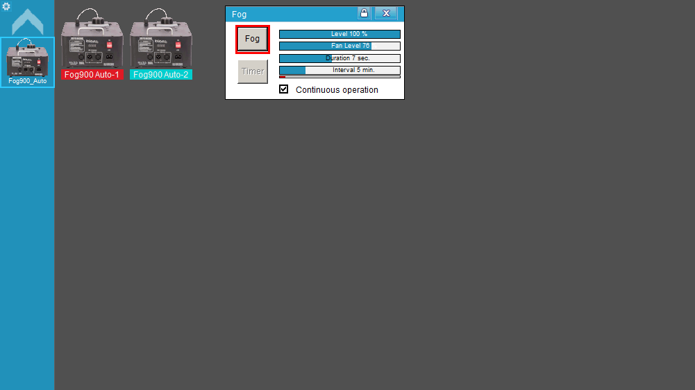 • Con el Botón de “Fog” dispara humo mientras que esté presionado el botón. Al soltar apaga. Si activa el box de “Continuos Operation” queda apretado el botón por lo que largará humo hasta que lo vuelva a presionar.