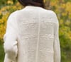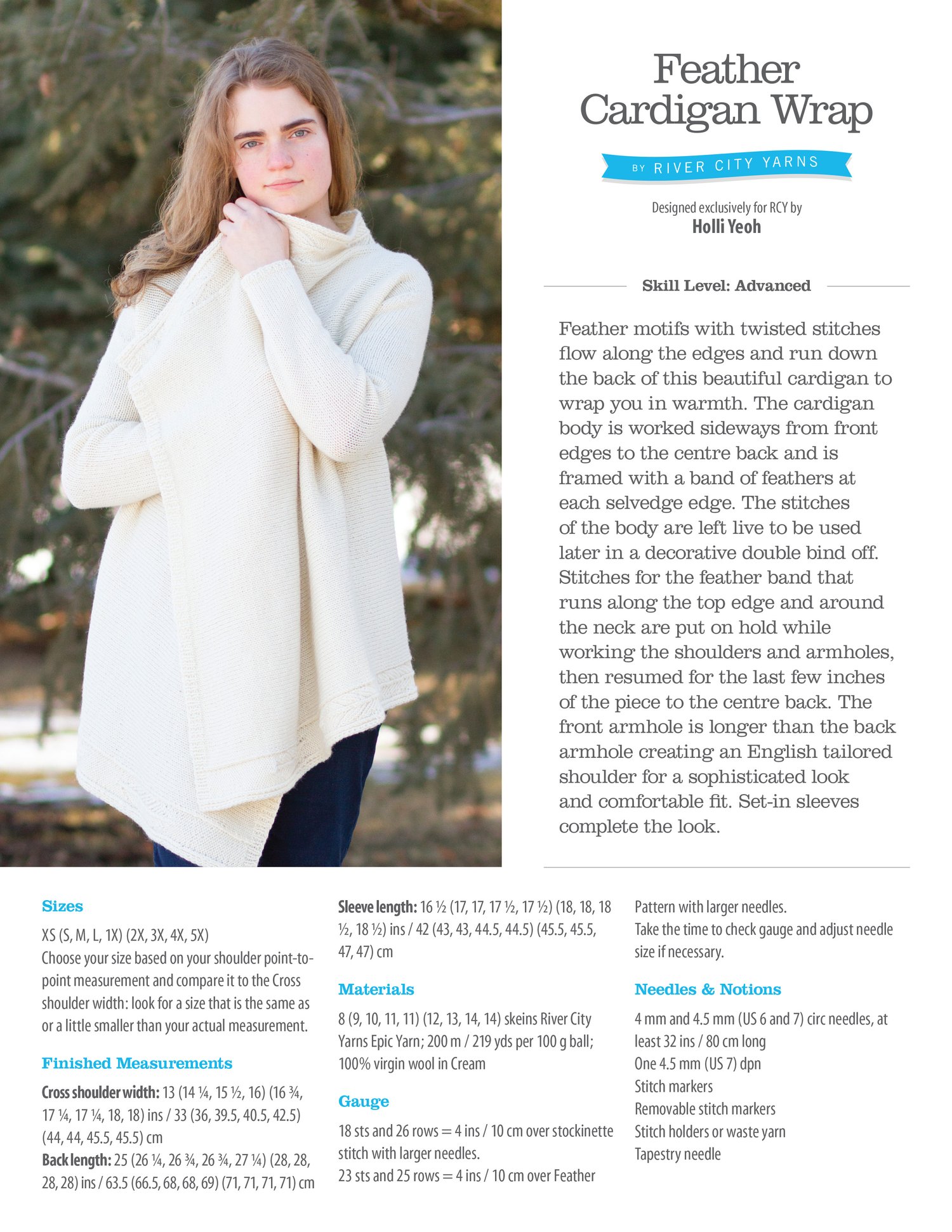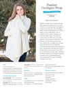 Feather motifs with twisted stitches flow along the edges and run down the back of this beautiful cardigan to wrap you in warmth. The cardigan body is worked sideways from front edges to the centre back and is framed with a band of feathers at each selvedge edge. The stitches of the body are left live to be used later in a decorative double bind off. Stitches for the feather band that runs along the top edge and around the neck are put on hold while working the shoulders and armholes, then resumed for the last few inches of the piece to the centre back. The front armhole is longer than the back armhole creating an English tailored shoulder for a sophisticated look and comfortable fit. Set-in sleeves complete the look.Â