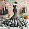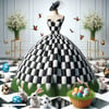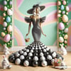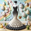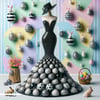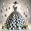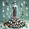 A true Met Gala marvel, this couture ball gown crafted entirely from black and white Easter eggs redefines avant-garde chic. Poised on a mannequin, the dress is a bold symphony of symmetry and contrast—each egg meticulously placed to create a dramatic silhouette. Paired with matching accessories and a luxe woven basket clutch, this piece is both playful and provocative, turning holiday nostalgia into high fashion.
