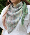 Smaller Woollen Version (pastel): 20 sts x 34 rows = 10 cm / 4” measured over garter stitch after blocking