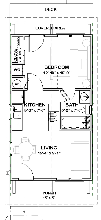 The Hope Cottage tiny home plan has one bedroom and one bathroom.