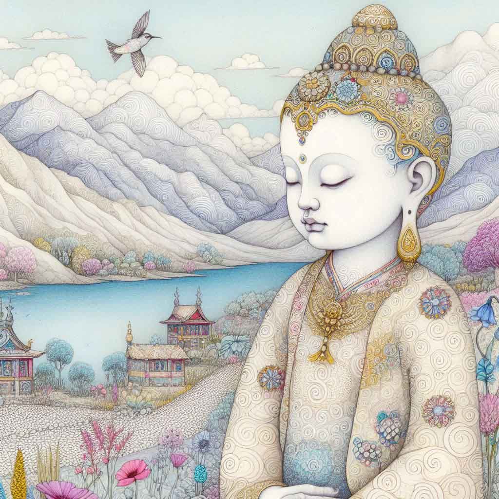 Beautiful child buddha with patterned mountains, a lake, flowers, trees & humming birds.