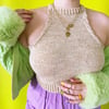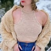 The Capricorn Sun crop was created during Capricorn season, my *birthday* season and an energizing time for channeling ambition, success, and owning your power! I originally designed this top for my birthday during the COVID pandemic to give me some happiness to wear. This garment is sleeveless and cropped with a high neck. An i-cord trim is used under the arms to form an edge that seamlessly transitions to the cabled details along the neckline. Modifications are given for different neck styles and different lengths, as well as options for waist shaping. After purchasing, you will receive a link to download 2 PDFs: the original version and a version with a wider front panel for those who desire more coverage!