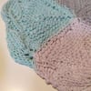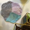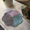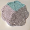 This pattern is worked in short row wedges with a garter stitch center and small stockinette leaves circling the border. Work 8 wedges for a smaller, tighter dishcloth, or work 9 wedges for a flatter laying, larger dishcloth.