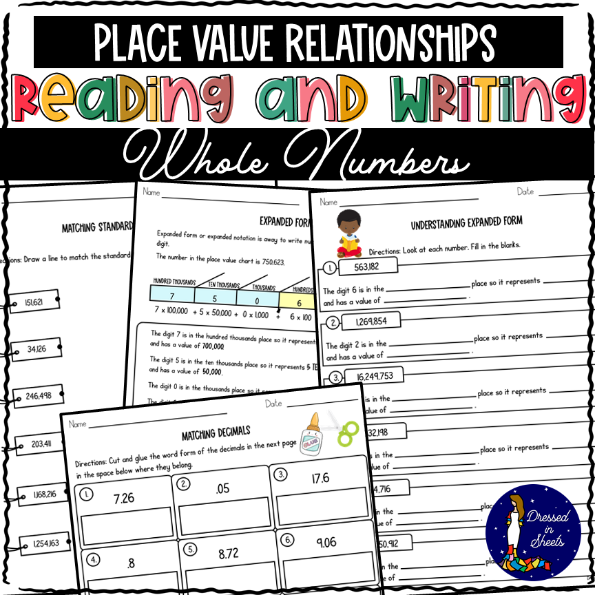 Are your students intimidated by large numbers? Do they know how to read them without hesitation? By the end of this unit, students will know how to read and write whole numbers confidently while also being able to read and write decimals up to the hundredths. This resource contains a wide variety of worksheets you can use to reinforce currently learned material or to give introduction to the world of whole numbers and decimals. Please note that some of the pages will require the use of colors, scissors, and glue for completion.