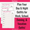 Can’t decide what to wear? Plan your outfits ahead of time with the daily & weekly outfit planners! Divided by day and night styling with plenty of room for adding your clothing, shoes & accessories choices.