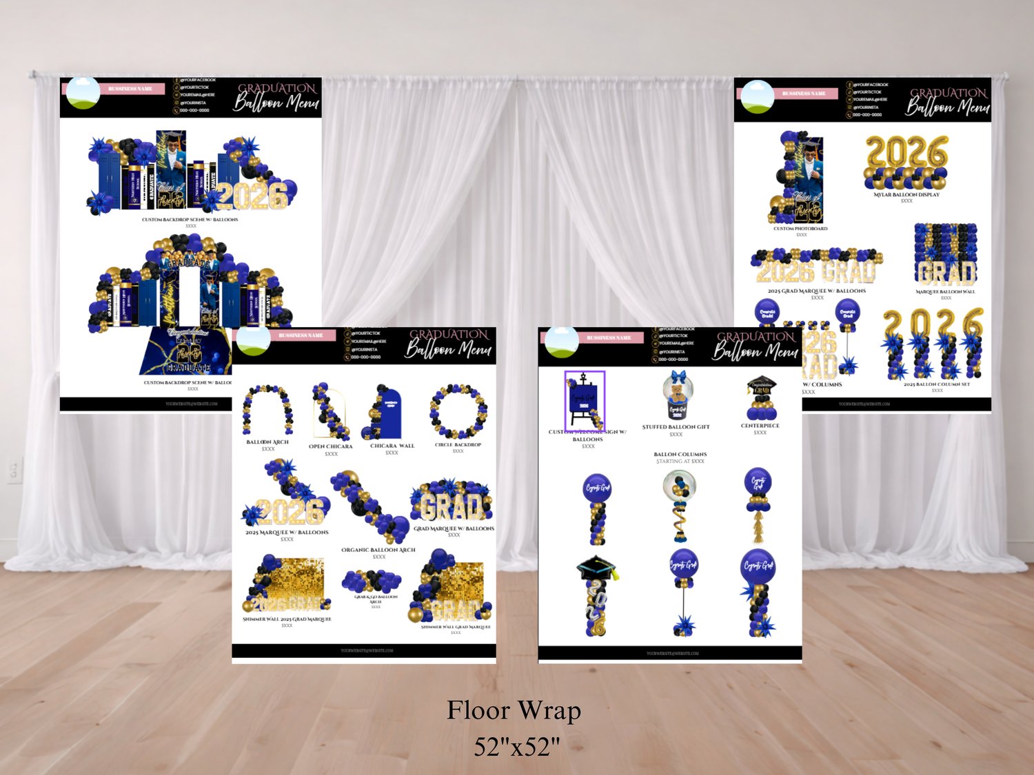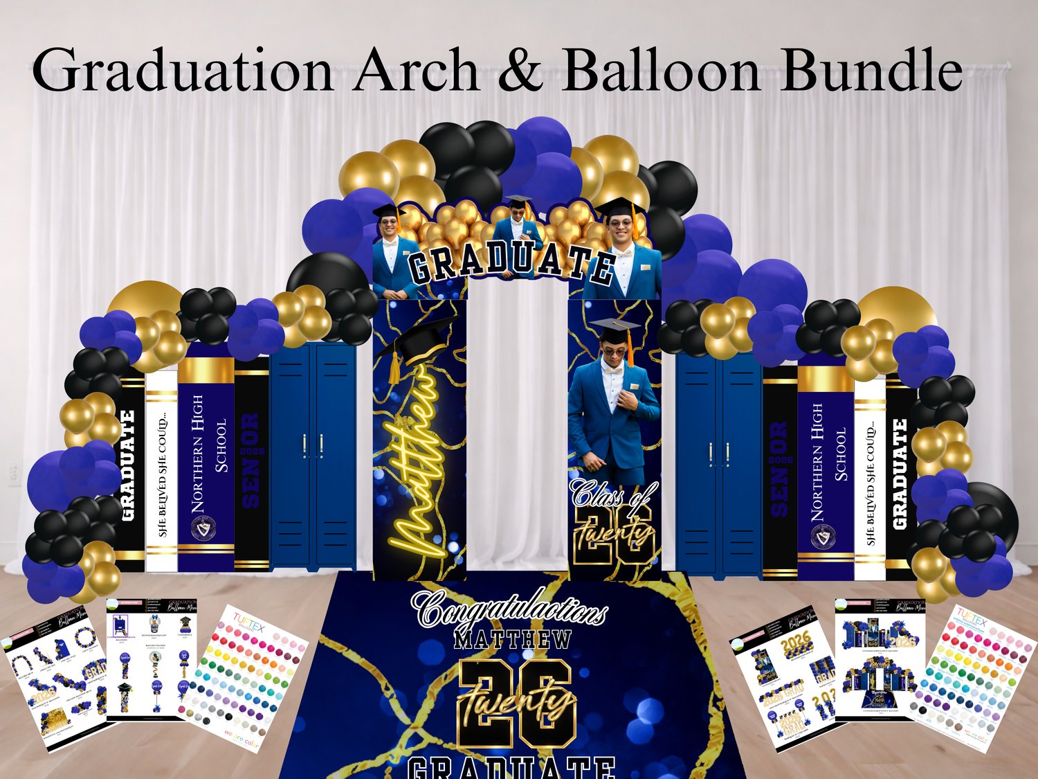 Full graduation backdrop and balloon business bundle including arch panels, locker and book cutouts, welcome sign, editable balloon menu, and color catalog.