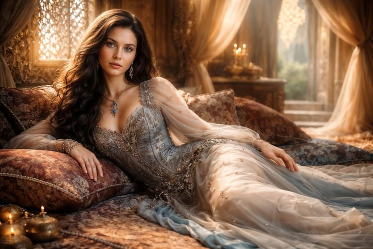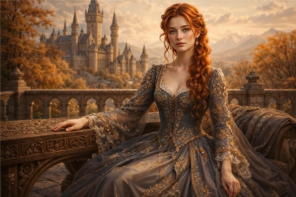 A 10K medieval artwork portraying a noblewoman with flowing copper-red hair seated in quiet elegance on a castle terrace, wrapped in a lavish gown of muted slate-blue and gold embroidery. Behind her, a grand fortress rises above an amber canopy of autumn trees, bathing the scene in warm, late-day light. The composition feels serene and storybook—an intimate pause between courtly duties—where soft lace, ornate stonework, and distant mountain haze merge into a calm, romantic tableau.