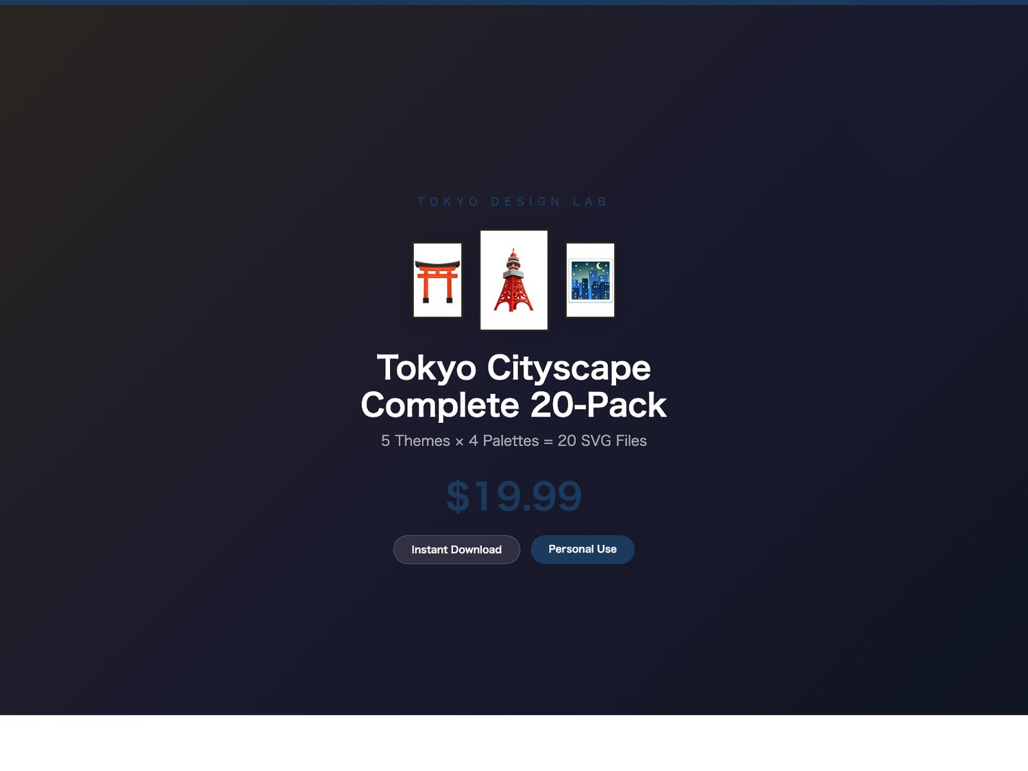 5 iconic Japanese landmark scenes x 4 stunning color palettes = 20 SVG files.