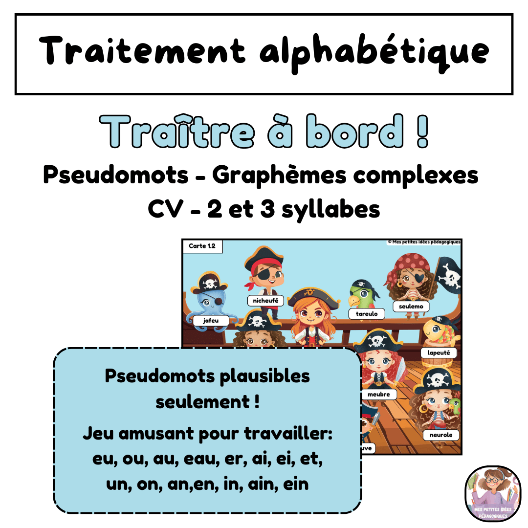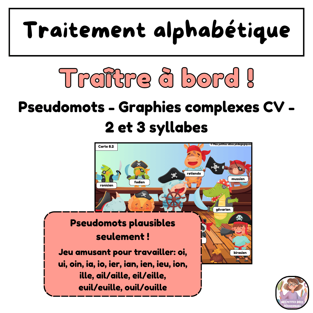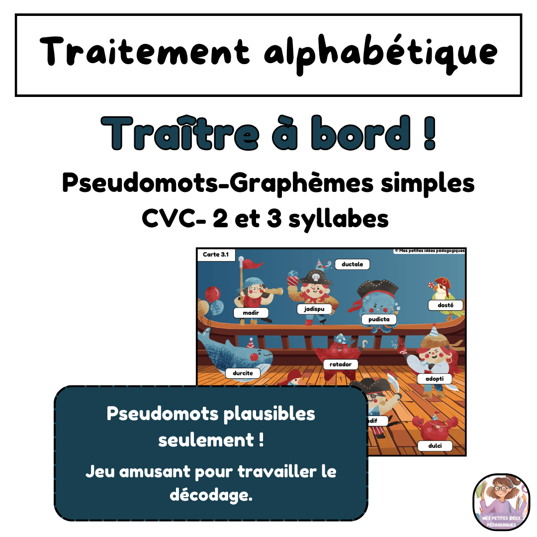 Travailler la voie d’assemblage en lecture en lisant des pseudomots variés. Cela améliorera par le fait même la fluidité en lecture de vos élèves ! En équipe de deux, les élèves doivent découvrir le ou les traitres à bord. Ils se questionnent en lisant les logatomes sur leur carte. Si certains sont absents, ils ont découvert les traitres.