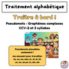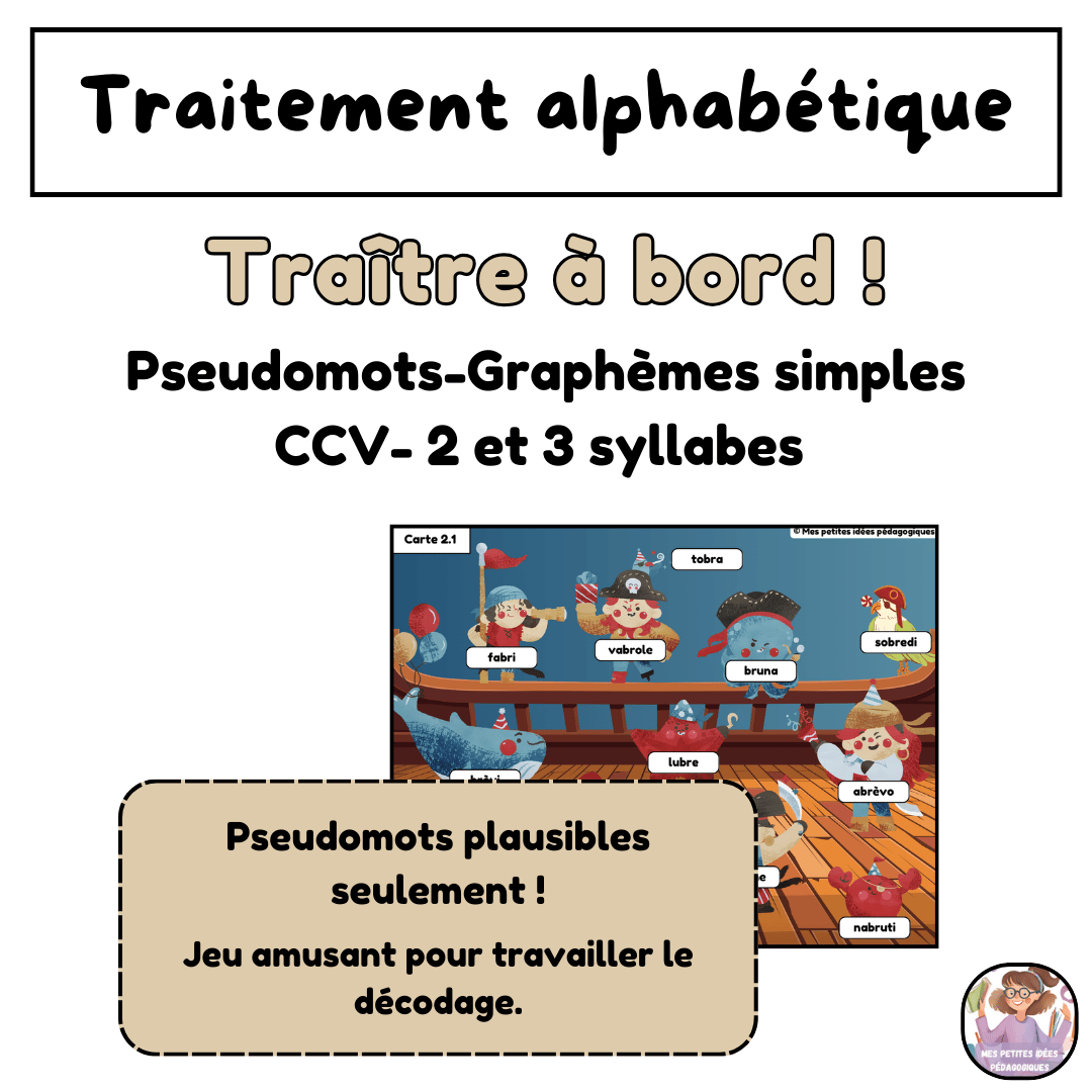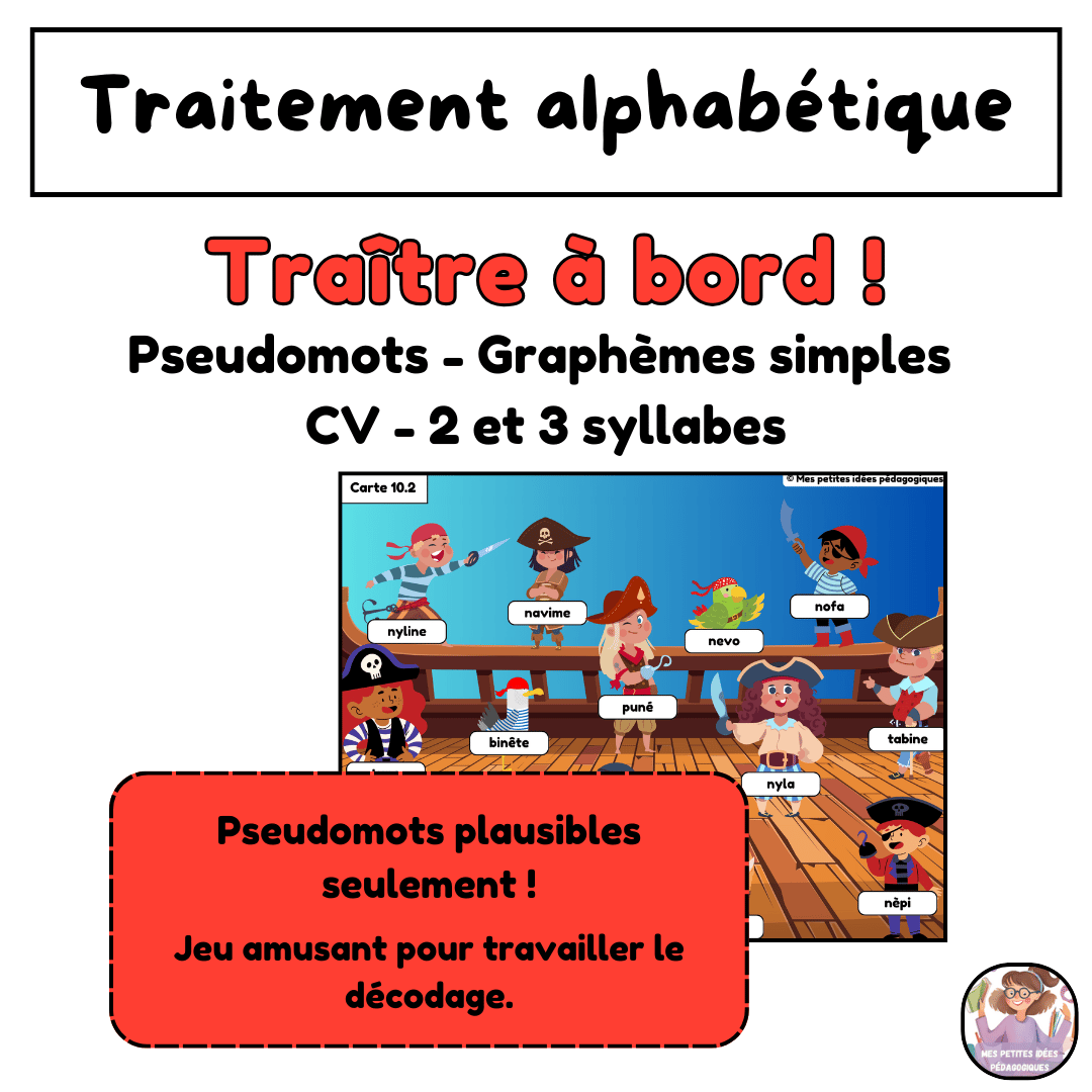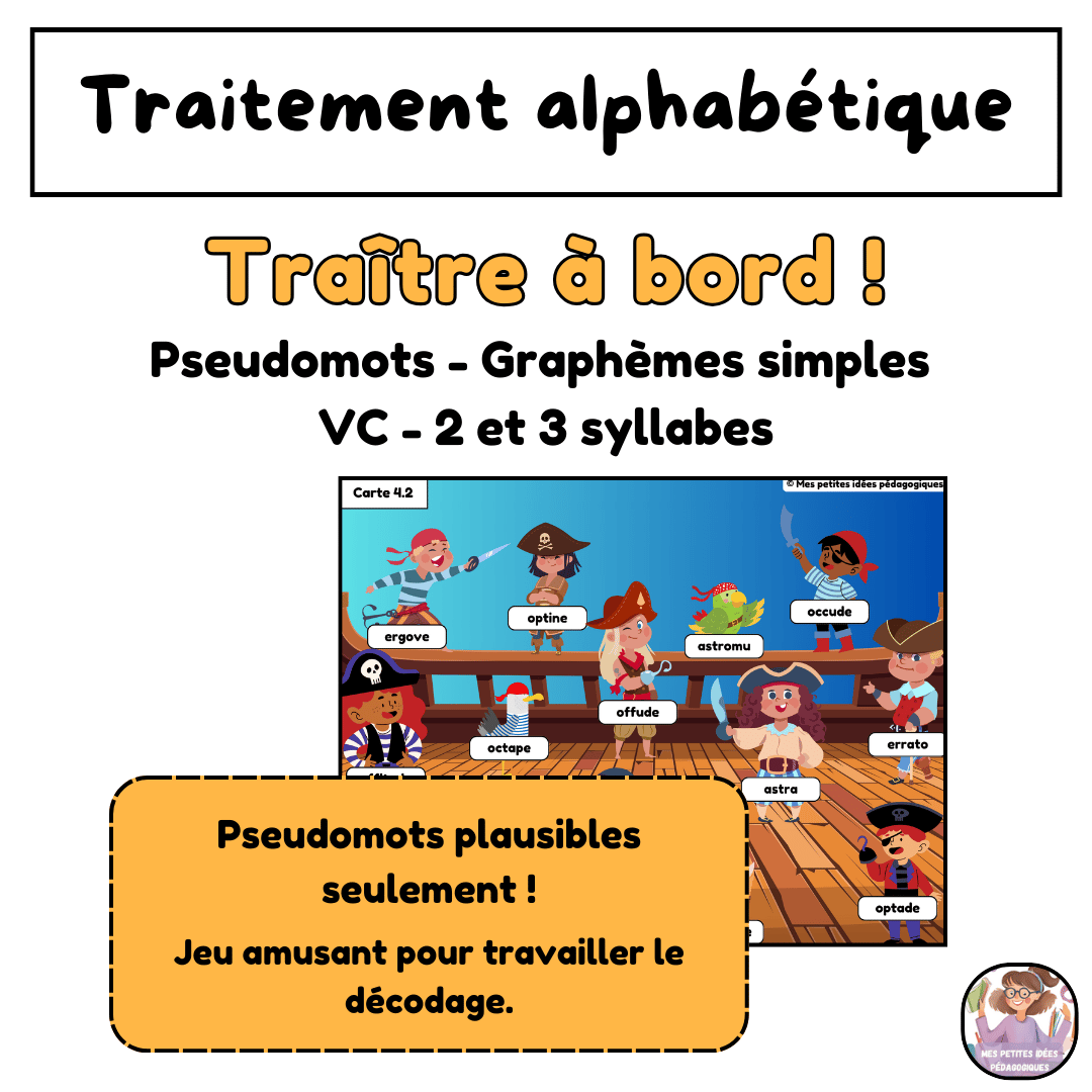 Travailler la voie d’assemblage en lecture en lisant des pseudomots variés. Cela améliorera par le fait même la fluidité en lecture de vos élèves ! En équipe de deux, les élèves doivent découvrir le ou les traitres à bord. Ils se questionnent en lisant les logatomes sur leur carte. Si certains sont absents, ils ont découvert les traitres.